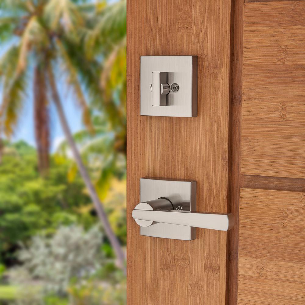 Prestige Spyglass Single Cylinder Satin Nickel Door Handleset with Square Spyglass Door Lever Feat SmartKey Security