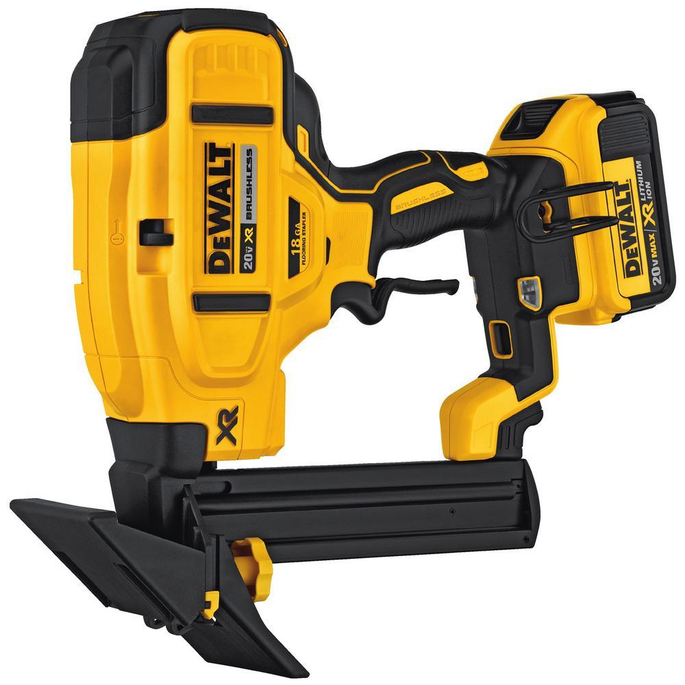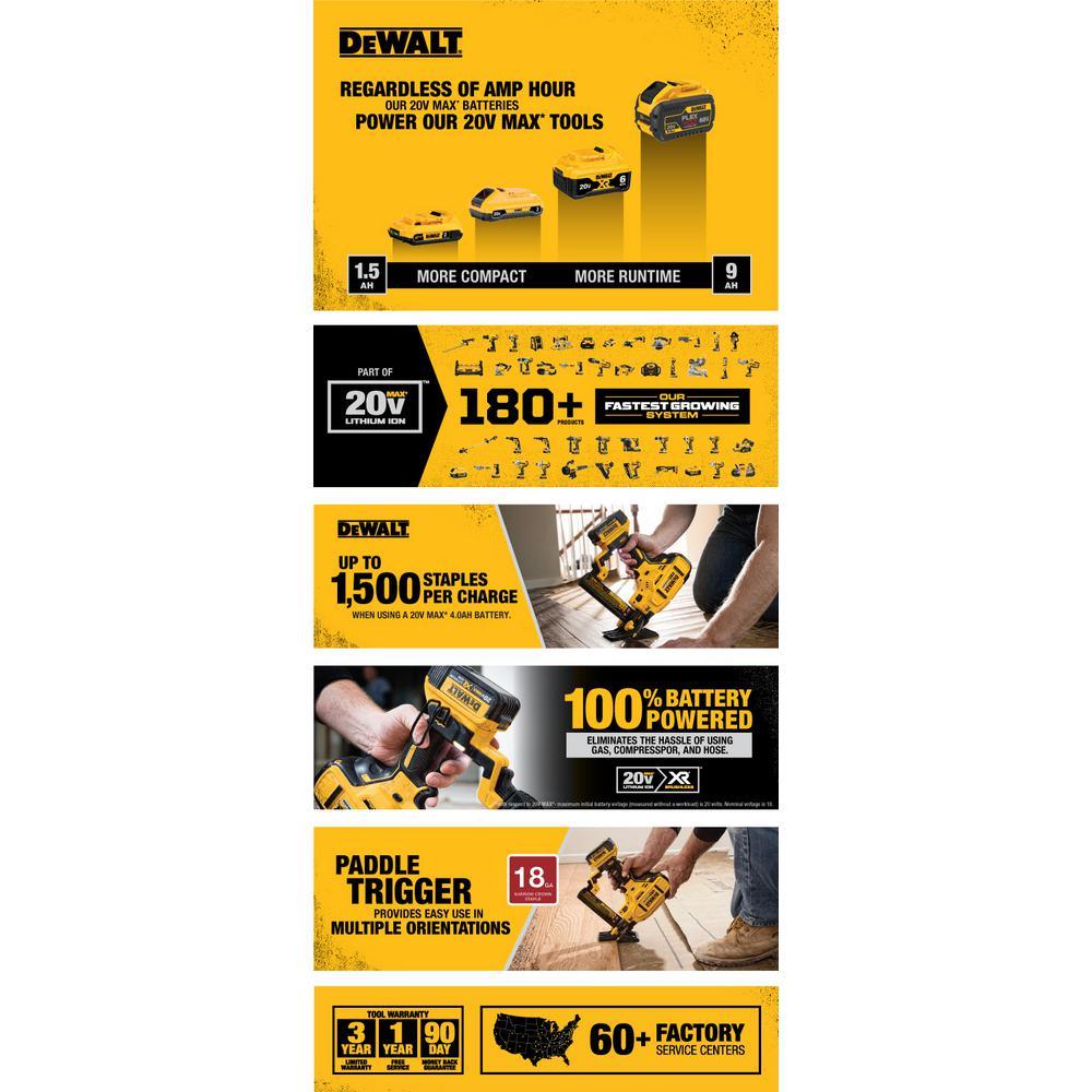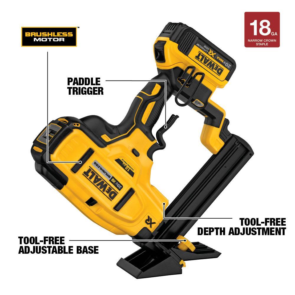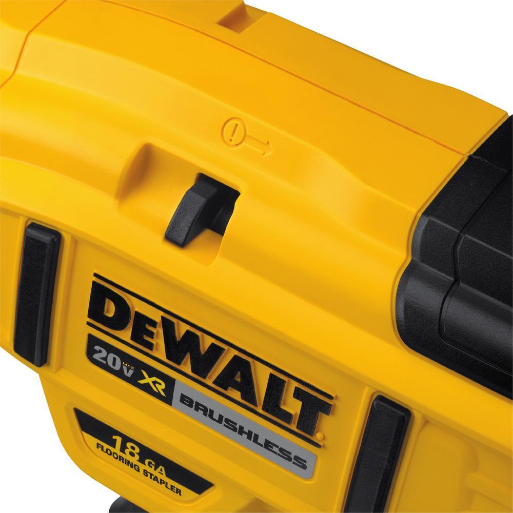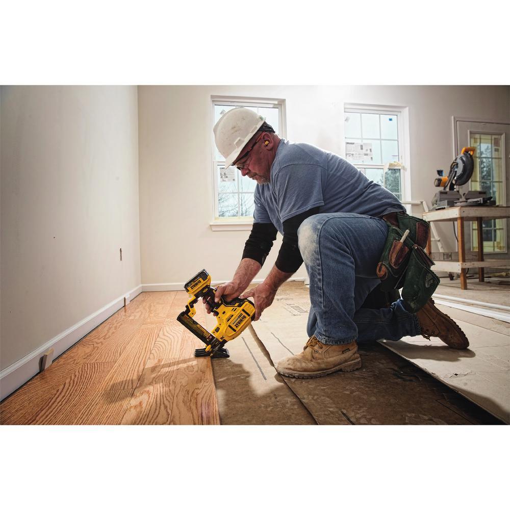 The DEWALT DCN682 18 Gauge Flooring Stapler drives 18 Gauge 1/4 in. narrow crown staples from 1/2 in. to 1-1/2 in. making it ideal for installing solid and engineered hardwood ranging in thickness from 3/8 in. to 5/8 in. A contact arm optimized for flooring, along with a tool-free adjustable base, help to drive fasteners accurately at the proper angle and depth. A brushless motor powered by a DEWALT 20V MAX Lithium-Ion battery make the DCN682 ready to go to work without the hassle of using gas, a compressor, or a hose. Tackle jobs both large and small with the features of a pneumatic tool and the freedom of cordless. Maximum initial battery voltage (measured without a workload) is 20-Volt. Nominal voltage is 18.