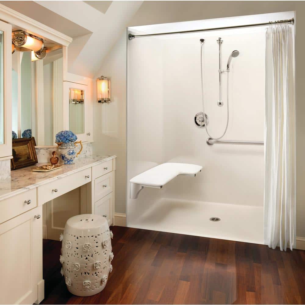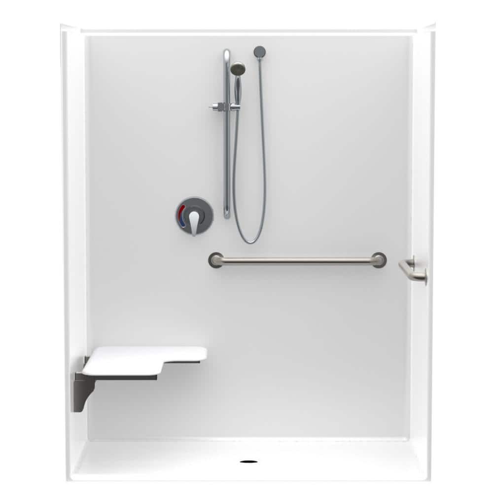 Regular price $3,588.95This one-piece ADA shower stall has been carefully designed to meet the needs of individuals who use wheelchairs or other mobility equipment. The 1603BFSD model is made of AcrylX applied acrylic reinforced with Armorcore, for a strong and durable finish. It features grab bars and a left-hand seat, and meets ADA guidelines with a pressure balancing mixing valve and hand-held shower assembly. This barrier-free unit is perfect for new construction projects due to its easy installation and smooth, high-gloss finish. The spacious interior measures 60 in. x 34 in. x 75 5/8 in. while the exterior measures 62 in. x 36 1/4 in. x 77 1/4 in. Aquatic is not liable for final code compliance, so please verify your local requirements. This product comes with a lifetime limited residential warranty, or a 30 year warranty for commercial installations. The textured floor provides slip-resistant safety.