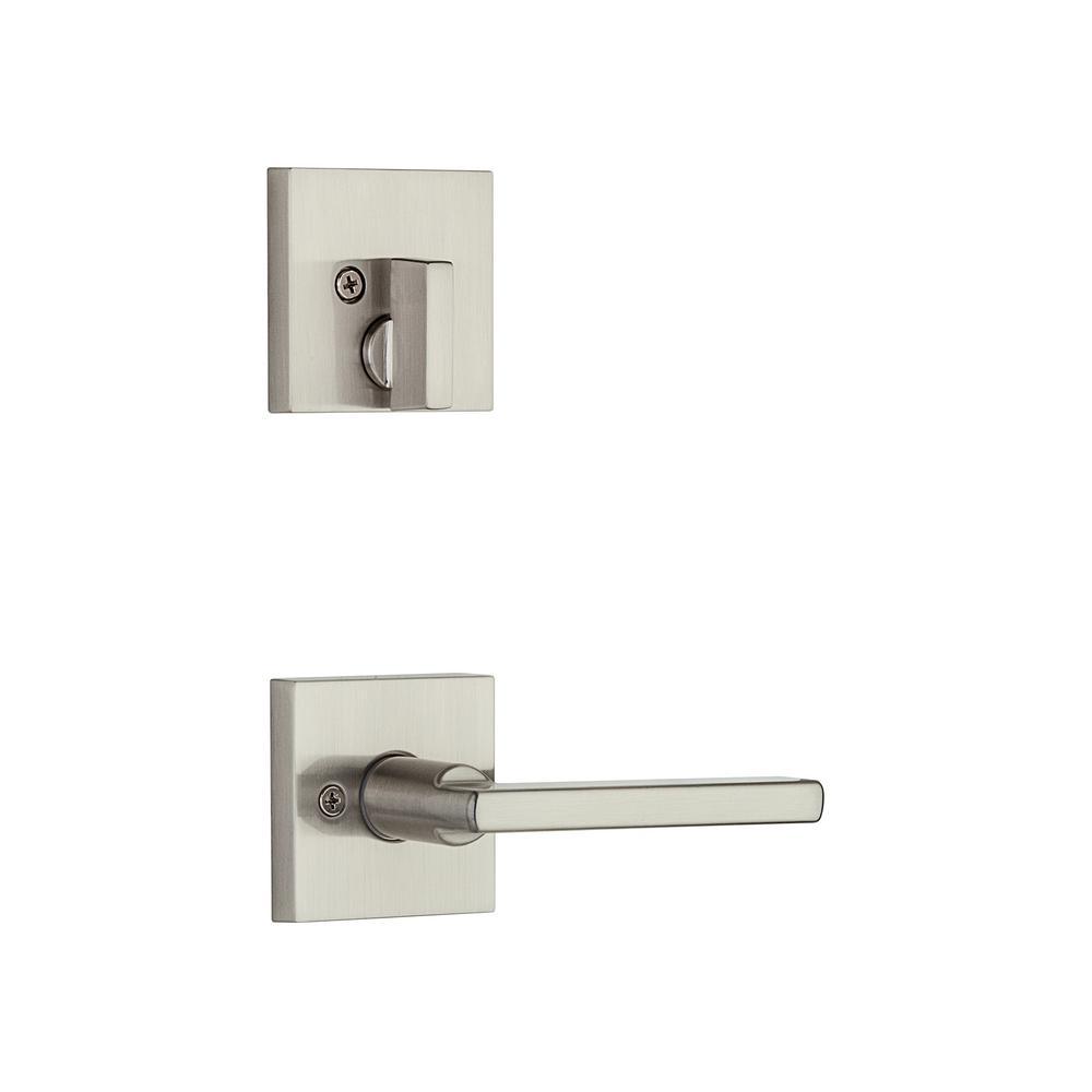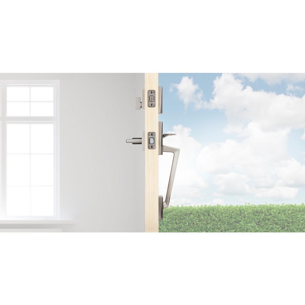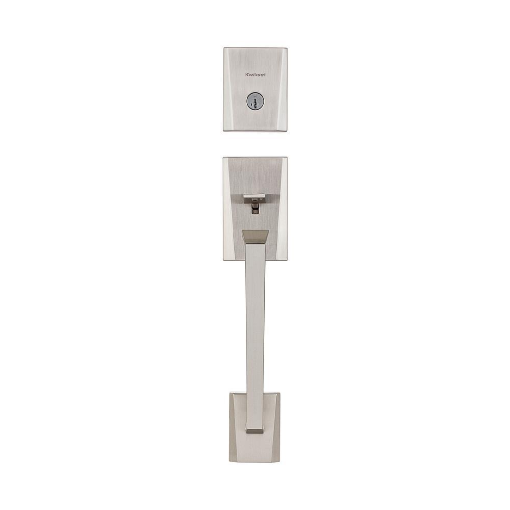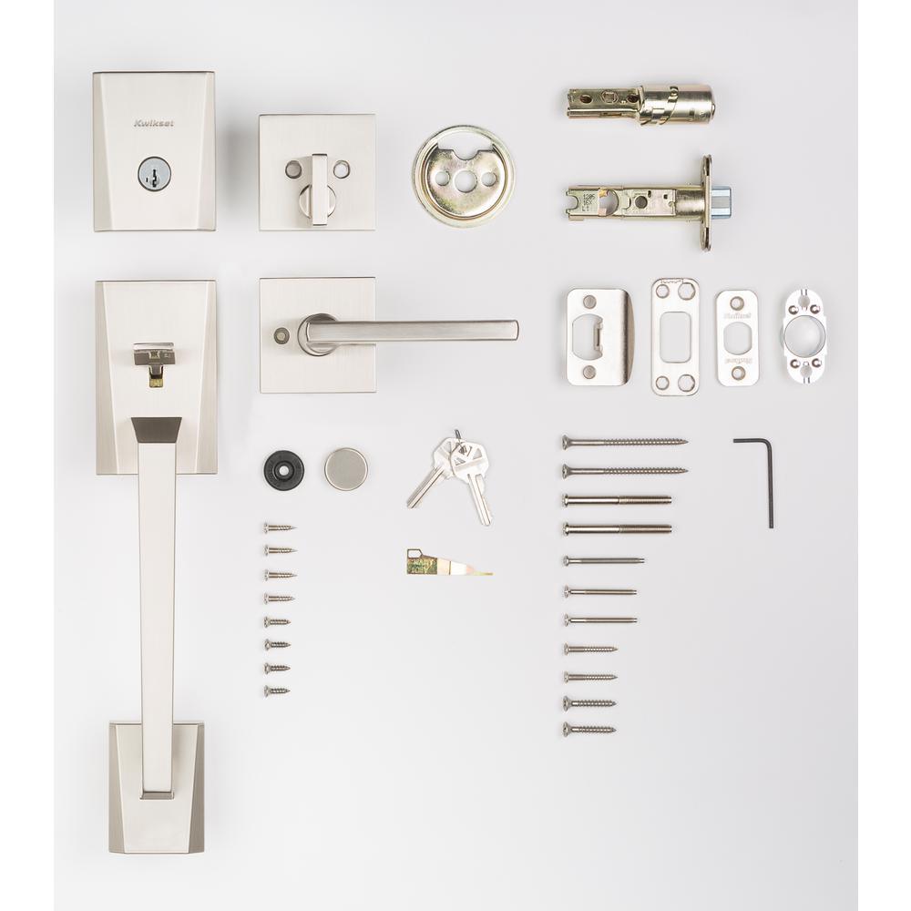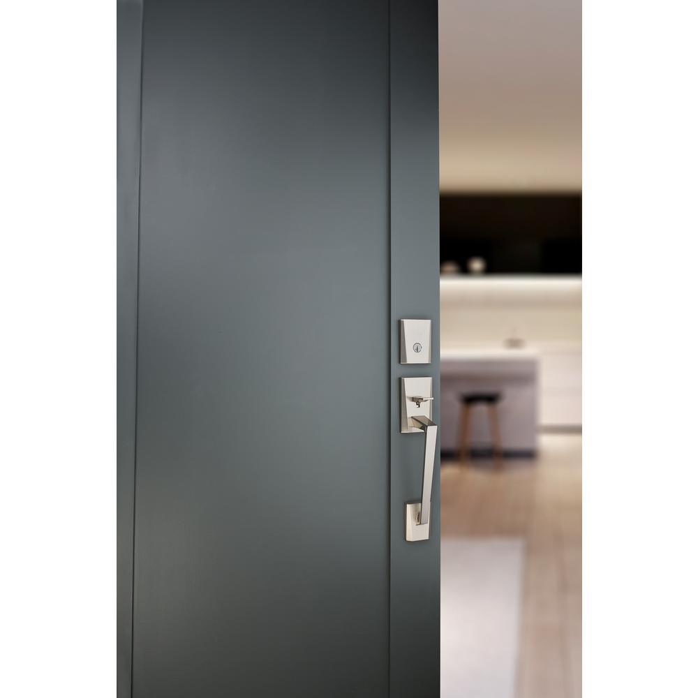 Step up to designer styles and superior security with Kwikset Signature Series products. The Camino handleset makes a bold statement with its faceted, geometric shape. This handleset includes a low-profile deadbolt and SmartKey Security Technology, which allows the homeowner to re-key their lock in seconds. Camino also features an adjustable screw that allows for easy door mounting and a guaranteed fit. Handleset can be locked or unlocked by a key from the outside or with a key/turn piece from the inside. The crisp, clean appearance of the Satin Nickel finish adds to the overall look of the product and brings a modern feel.