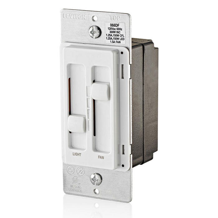 Control your ceiling fan and light from a single Decora-style device. The Leviton SureSlide dual control provides separate slide controls for fan speed and light dimming, optimized for LED/CFL and compatible with incandescent and halogen loads.