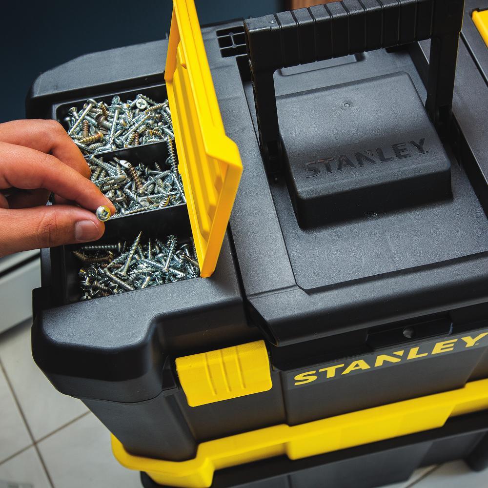 The Essential Rolling Workshop provides 3 storage solutions in 1 product. Included are Bottom Bin, Middle Tote Tray and Top Tool Box. With top organizers for small parts organization and 7 in. coated wheels for convenient and easy maneuverability, this product is ideal for a wide range of applications.