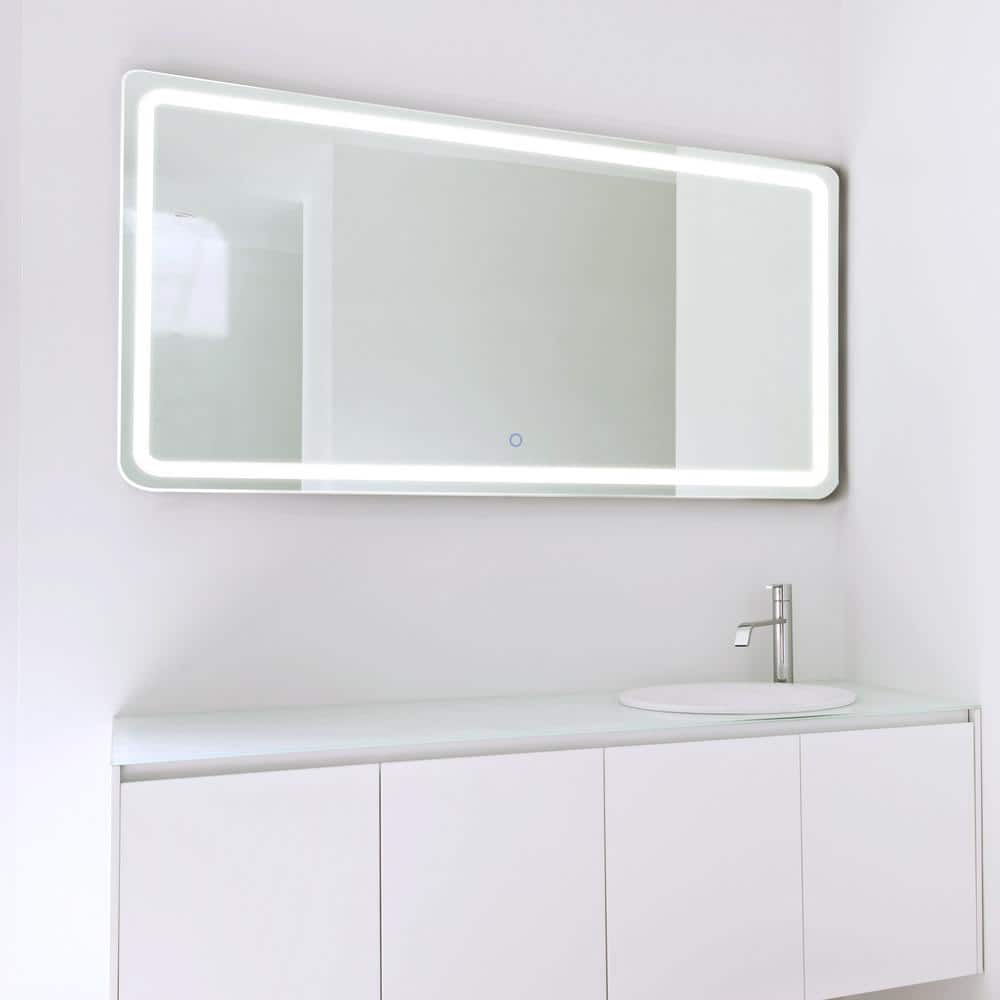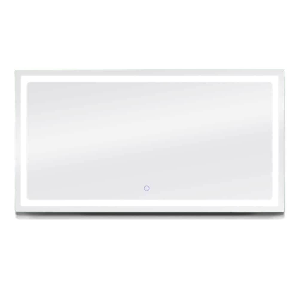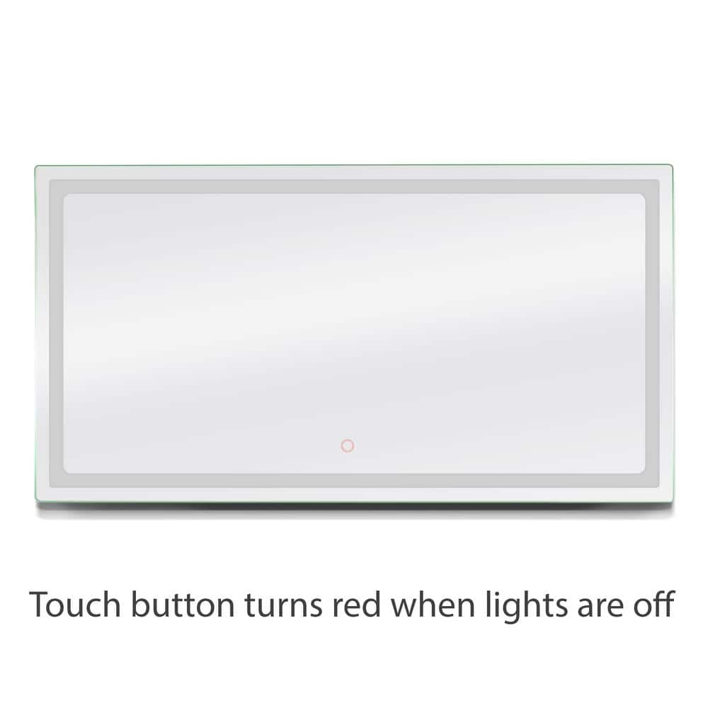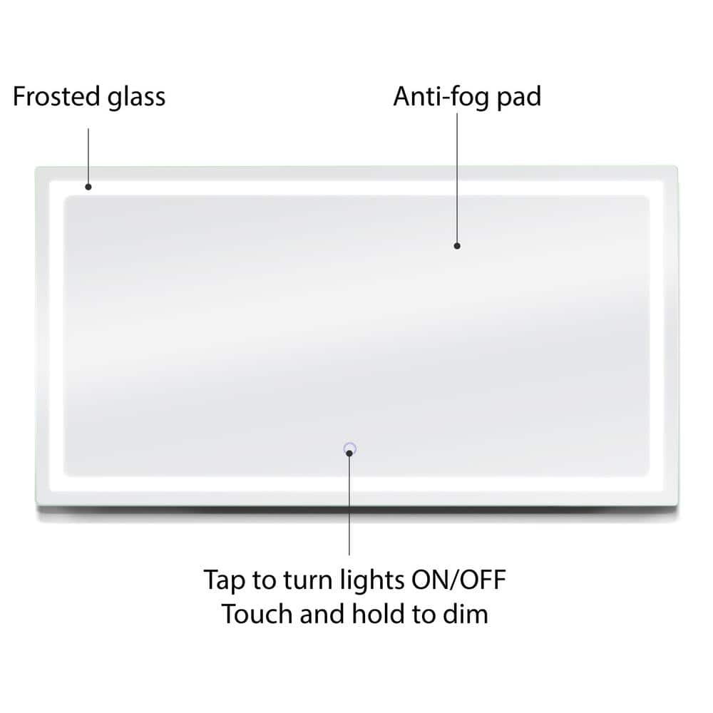 A large, frameless LED backlit bathroom vanity mirror designed for wall mounting. Touch controls provide on/off and dimming, while a built‑in anti‑fog pad keeps the glass clear after hot showers. Durable silver mirror construction delivers enhanced clarity for daily grooming.