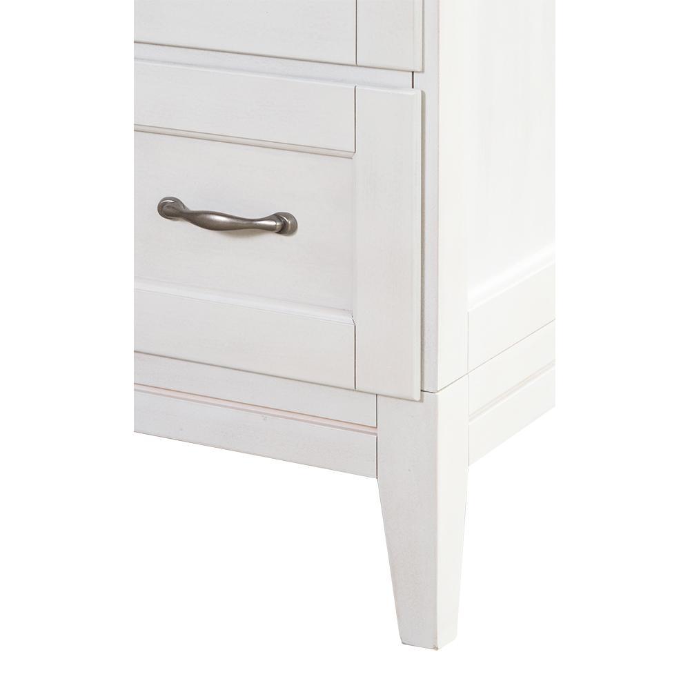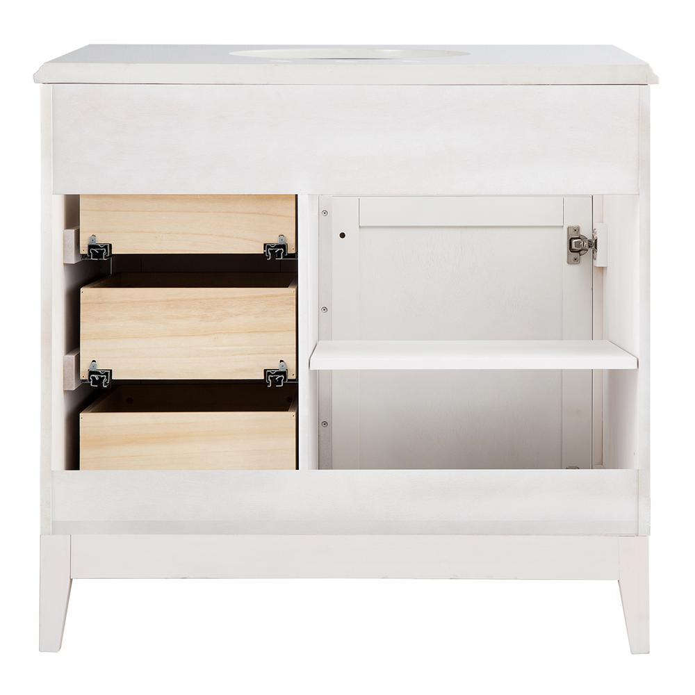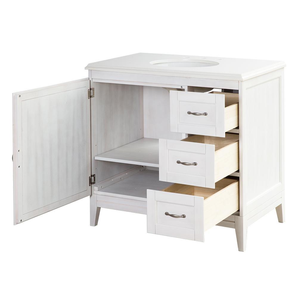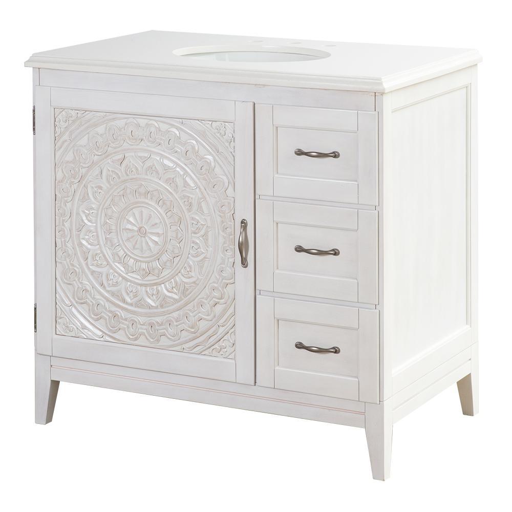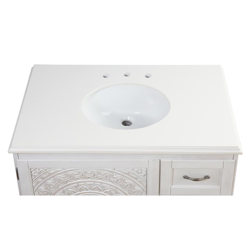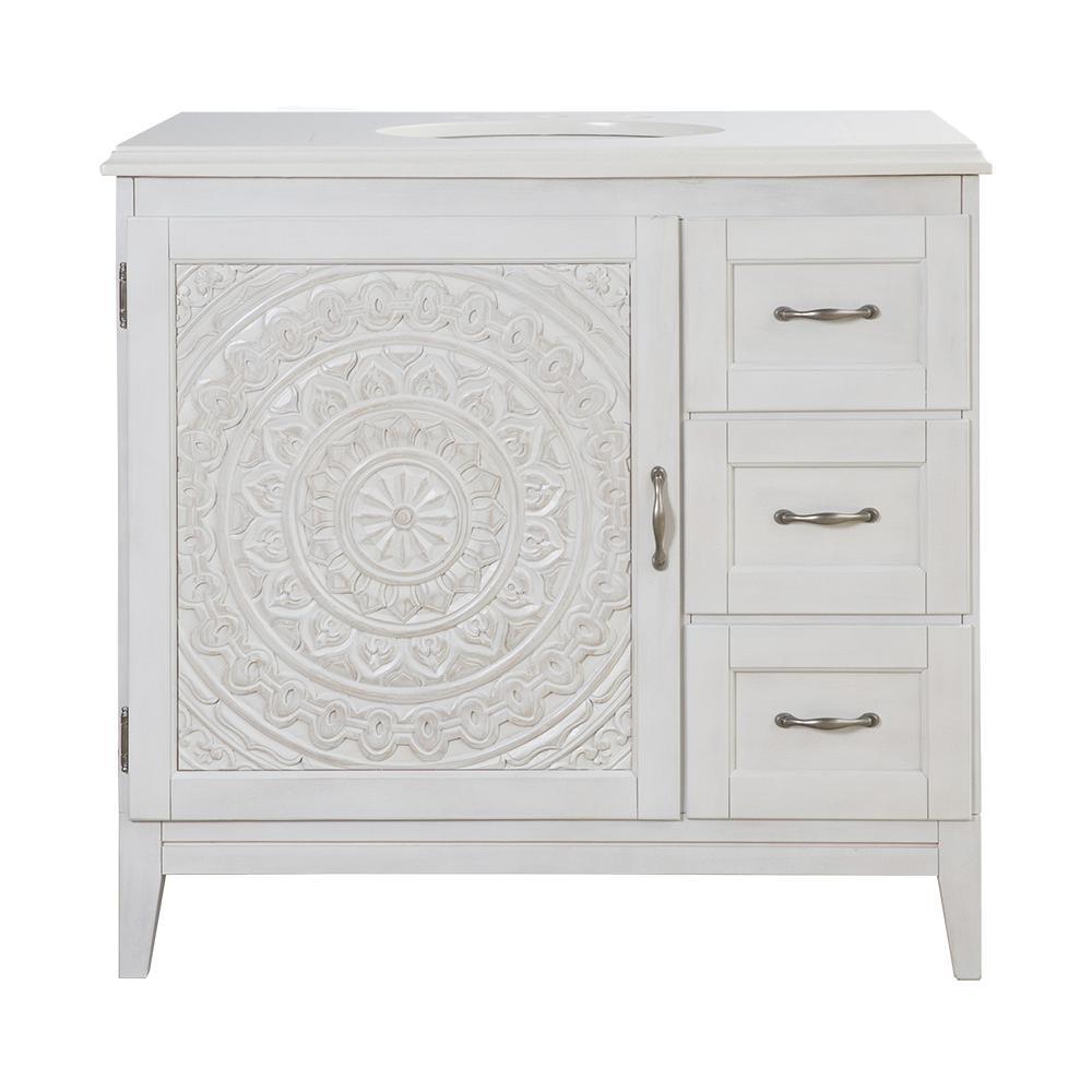 Functionality meets style in our Chennai 37 in. W Single Bath Vanity. Featuring a smooth, white engineered stone top and white basin in a beautiful white wash finish, this vanity provides ample storage space for towels, accessories and more. At 35 in. H and 22 in. D the Chennai vanity is perfect for smaller sized bathrooms without sacrificing counter space. Enjoy easier morning routines while making the most of your small space, or even add a second vanity in larger bathrooms for a luxuriously stunning look. Pair this vanity with faucets in complementary finishes that highlight the Chennai's brushed-nickel handles and unique medallion design carefully carved into the cabinet doors. This stylish single bath vanity adds an elegant, chic feel to any bath.