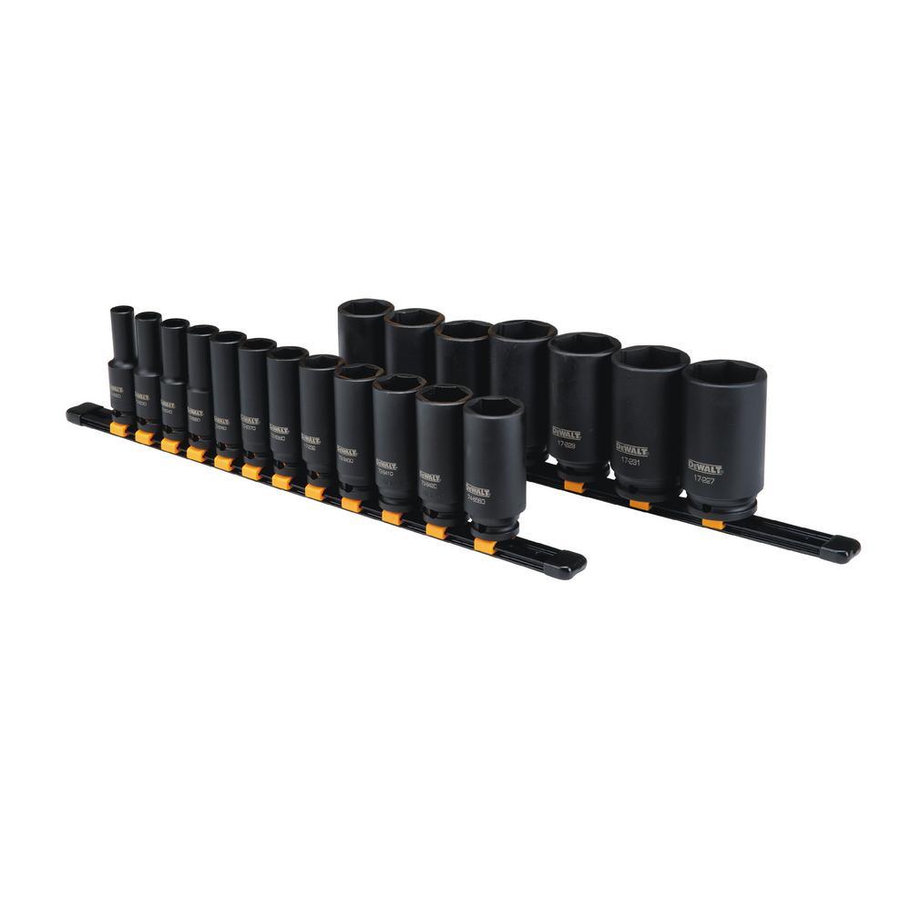 The 19-Piece Deep Impact Socket Set offers a wide variety of sockets for any user need. These sockets have DirectTorque technology to help prevent rounding of fasteners and provide better grip. This set includes SAE 3/8, 7/16, 1/2, 9/16, 5/8, 7/8, 11/16, 3/4, 13/16, 15/16, 1, 1-1/16, 1-1/8, 1-3/16, 1-1/4, 1-5/16, 1-3/8, 1-7/16 and 1-1/2 sockets.