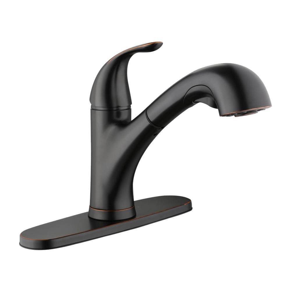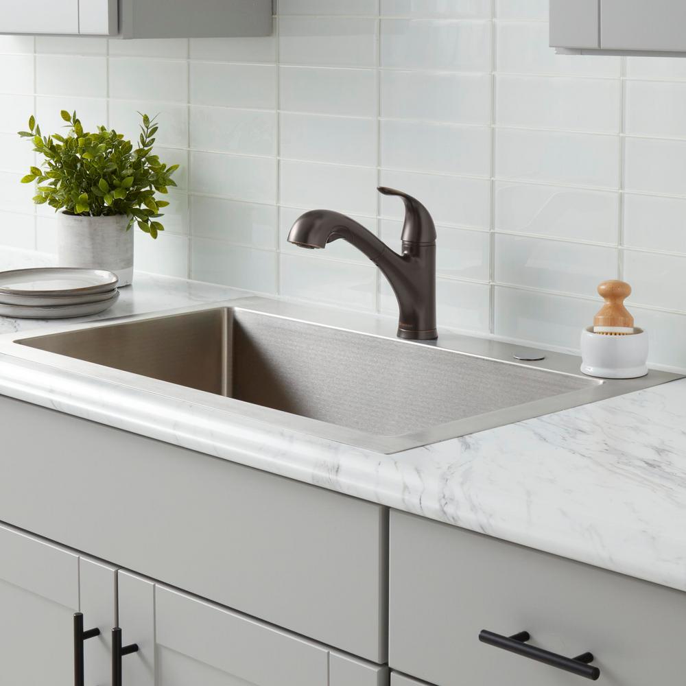 The Glacier Bay Market Single-Handle Pull-Out Sprayer Kitchen Faucet in Bronze is constructed of solid metal to ensure long-lasting performance and enjoyment. Its single lever handle meets ADA standards for ease of use in adjusting water temperature and volume. The pull-out sprayer features an aerated spray and a new TurboSpray that is exclusive to Glacier Bay. The TurboSpray provides a stronger spray pattern than your standard pullout faucet. The sprayer also includes a 29.5 in. braided supply hose with 25.2 workable length for an extended reach, making it ideal for filling large pots and pans or washing down the sink. This kitchen faucet also includes the exclusive FastMount mounting system to make installation quicker and easier.