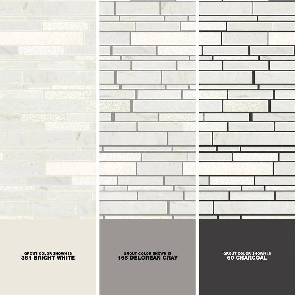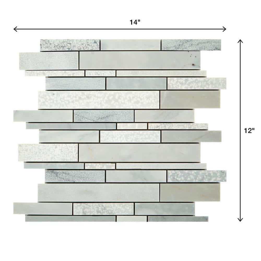 A 100% marble linear mosaic sheet designed for walls and backsplashes, offering a refined Glacier finish in a matte look. Each 12 in. x 14 in. sheet covers 1 sq. ft. and features interlocking pieces for seamless installation in kitchens, bathrooms, and accent walls.