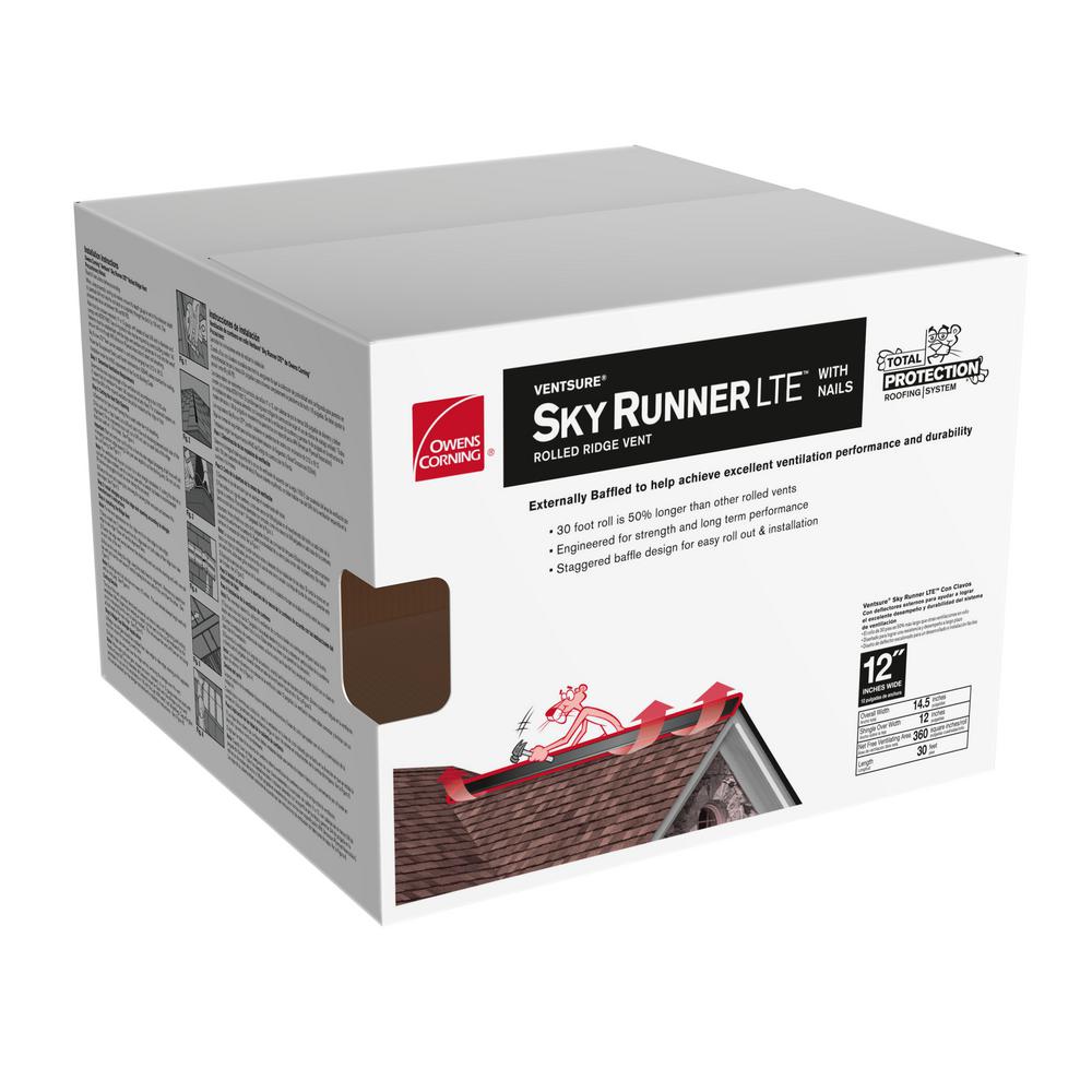 Sky Runner LTE 30 foot roll vent is Long, Tough and Easy to Install, making it an excellent choice for your next roofing job. Optimized intake and exhaust ventilation allows air to flow through the attic-resulting in improved home energy efficiency and performance of the shingles. Without proper ventilation, excessive heat and moisture can buildup, which can lead to ice damming, higher energy costs and roof deterioration. Sky Runner LTE carries a Limited Lifetime Warranty when installed with other Owens Corning roofing products as part of the Total Protection Roofing System.
