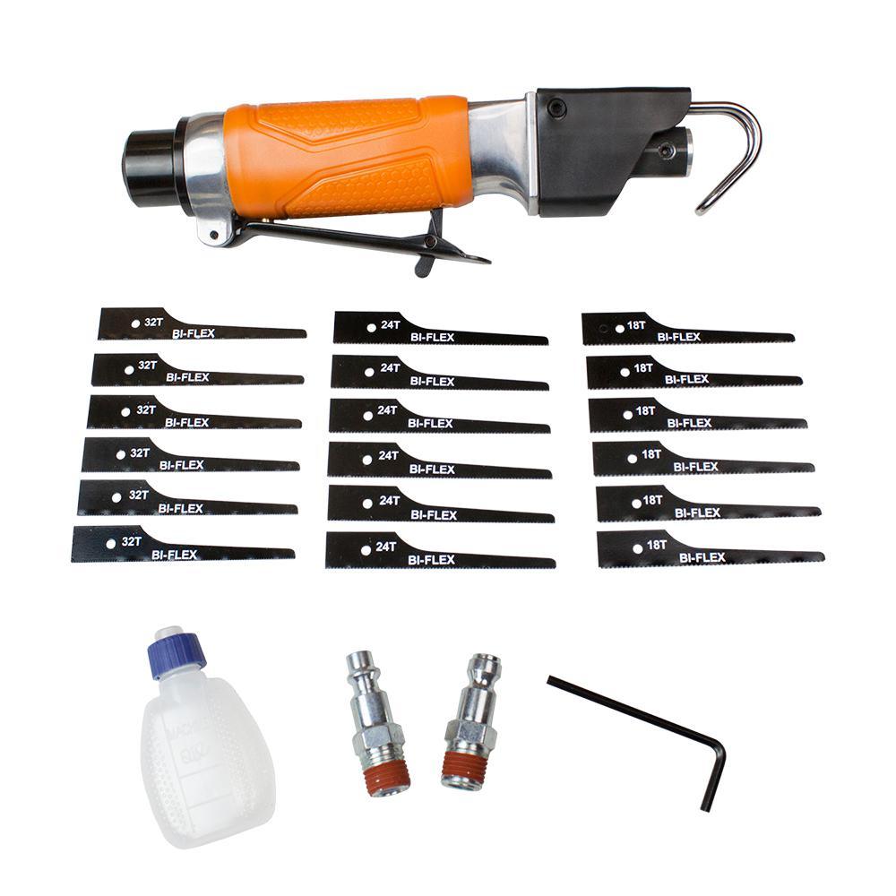 The Freeman FATRS Reciprocating Saw makes straight and curved cuts with ease, making it the ideal tool for fender trimming, muffler and exhaust work, sunroof installations, body shop repair and more. Delivering 10,000 strokes per minute, it easily cuts through 1.6 mm steel, 2 mm aluminum and plastics and fiberglass up to 2.5 mm thick. The lightweight and compact design makes it easy to maneuver in tight spaces, ensuring you can stay on your marks and make precise cuts every time. The self-locking variable speed trigger provides additional control, while the positive blade retainer and adjustable blade guide make it easy to adjust the cutting depth. The FATRS also includes two 1/4 in. NPT fittings (automotive and industrial), 6 extra-coarse 18 TPI blades, 6 standard 24 TPI blades and 6 extra-fine 32 TPI blades to tackle a variety of projects right out of the box. The aluminum construction and quality internal parts are designed to last and are backed by Freeman's 7 Year Limited Warranty and a 90 Day Wearable Parts Warranty.