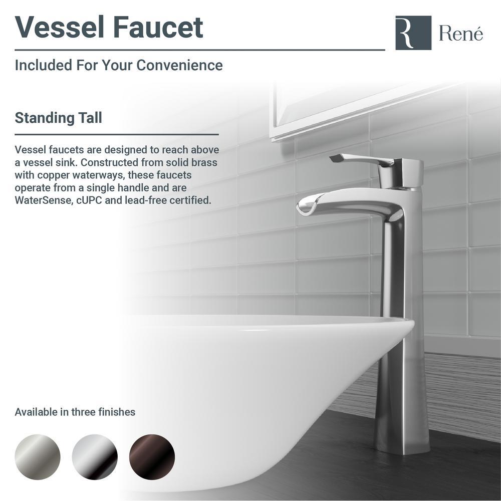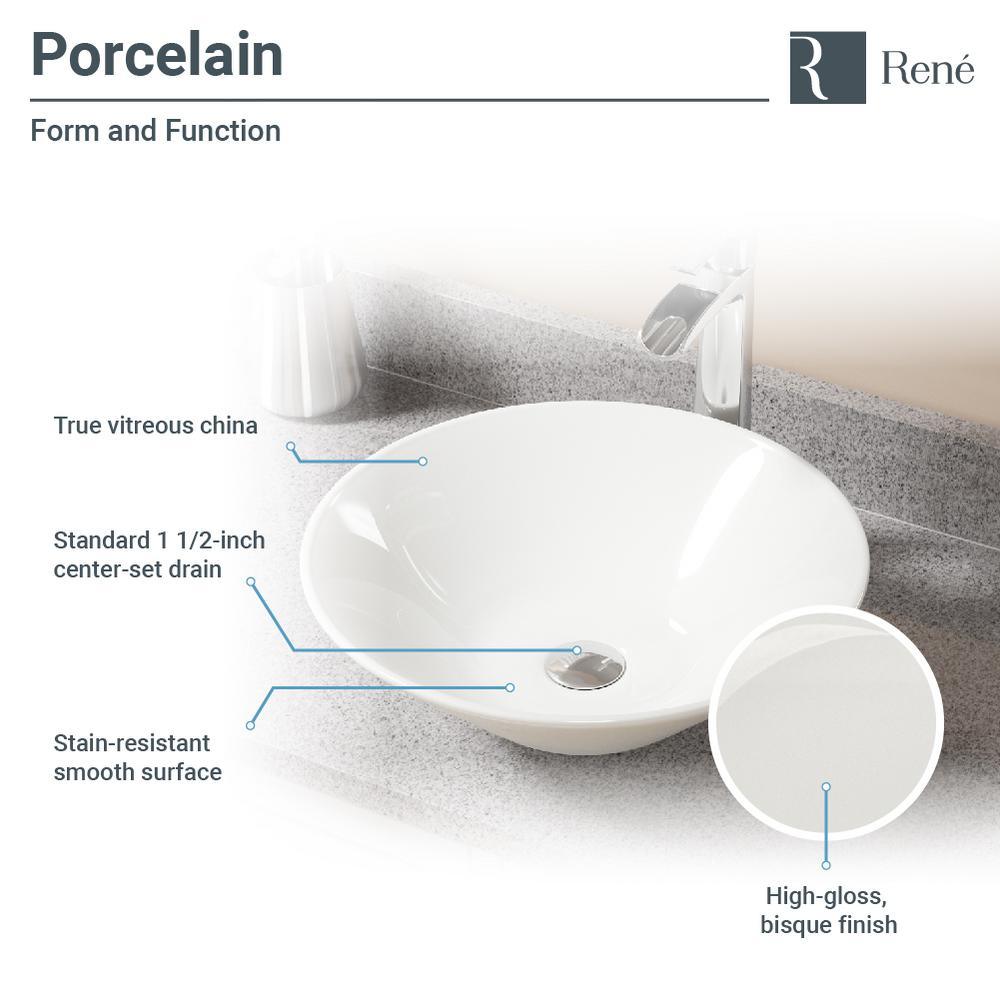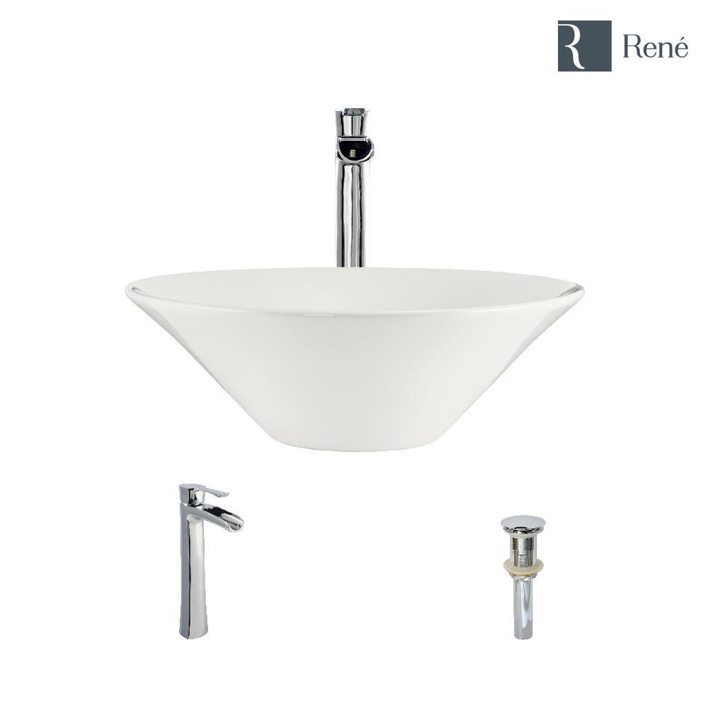 This attractive, biscuit-colored, porcelain basin is designed to be mounted atop the counter to display its natural beauty. Circular in shape, its vitreous china finish glistens with charm and durability. The R2-5015-B is constructed of solid porcelain but with a special additional enamel added at the end of its firing, turning it into a hardened, true, vitreous china. On its own, porcelain is both beautiful and durable, but the additional vitreous china coating creates an even more impervious and sanitary surface. It measures 16-1/2 in. x 16-1/2 in. x 5-3/4 in. The R9-7007-C is a tall, vessel-style faucet soundly constructed of premium-quality, solid brass components. Its design is contemporary, but with a nostalgic, water pump spout design in a chrome finish. Water temperature and pressure is controlled by the extended, swivel handle. Ceramic disc cartridges assure dependability. With a simple press to its handsome, chrome dome; the included, spring-loaded, vessel pop-up drain (vpud) can be opened or closed.