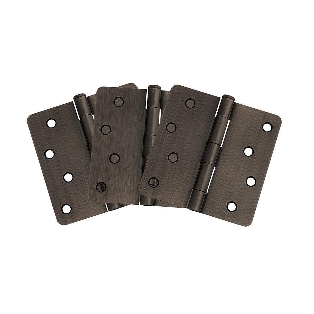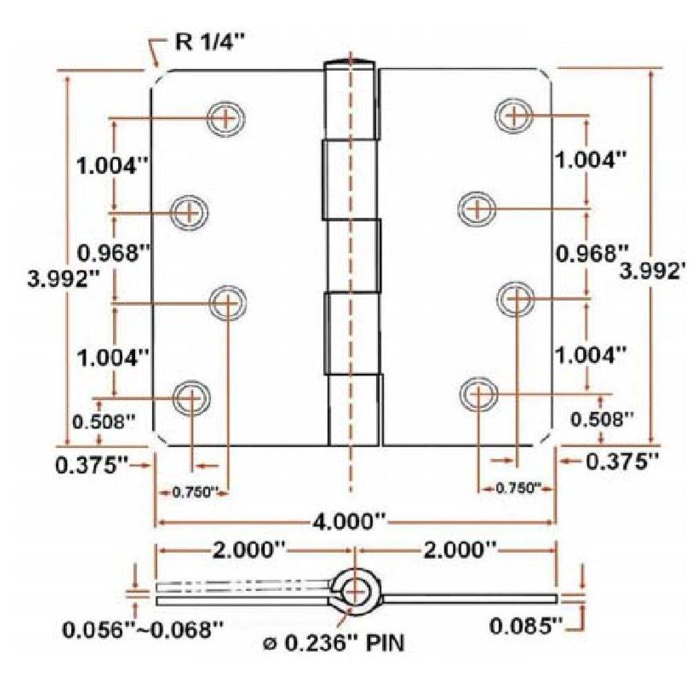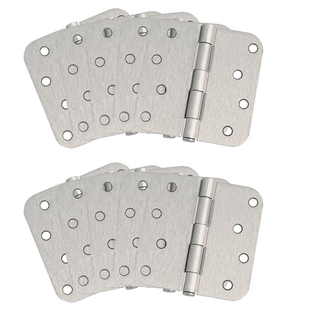 The Design House 202549 10-Pack Hinge 4 in. in Satin Nickel has a 1/4 in. radius corner, for use on residential duty wooden doors. These door hinges are made of steel with a staggered hole pattern. Each hinge has 8 holes and measures 4 in. x 4 in. x 1/2 in. These hinges do not have a removable pin and screws are included. Design House offers products in multiple home decor categories including lighting, ceiling fans, hardware and plumbing products. With years of hands-on experience, Design House understands every aspect of the home decor industry and devotes itself to providing quality products across the home decor spectrum.
