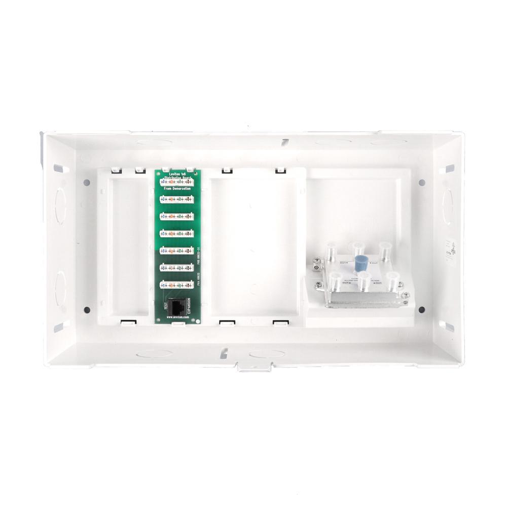 The Leviton Multi-Dwelling Unit Structured Media Enclosure 47604-F6S is designed to deliver a compact distribution point for basic telephone and video in multi-unit buildings. The is enclosure is made of ABS molded plastic to provide a cost-effective, timesaving solution. This unit can accommodate a variety of telephone/video distribution configurations. It can accommodate up to three telephone expansion boards and one Passive Video Splitter. This enclosure is ideal of apartments, military, senior and campus housing as well as urban mixed-use applications.