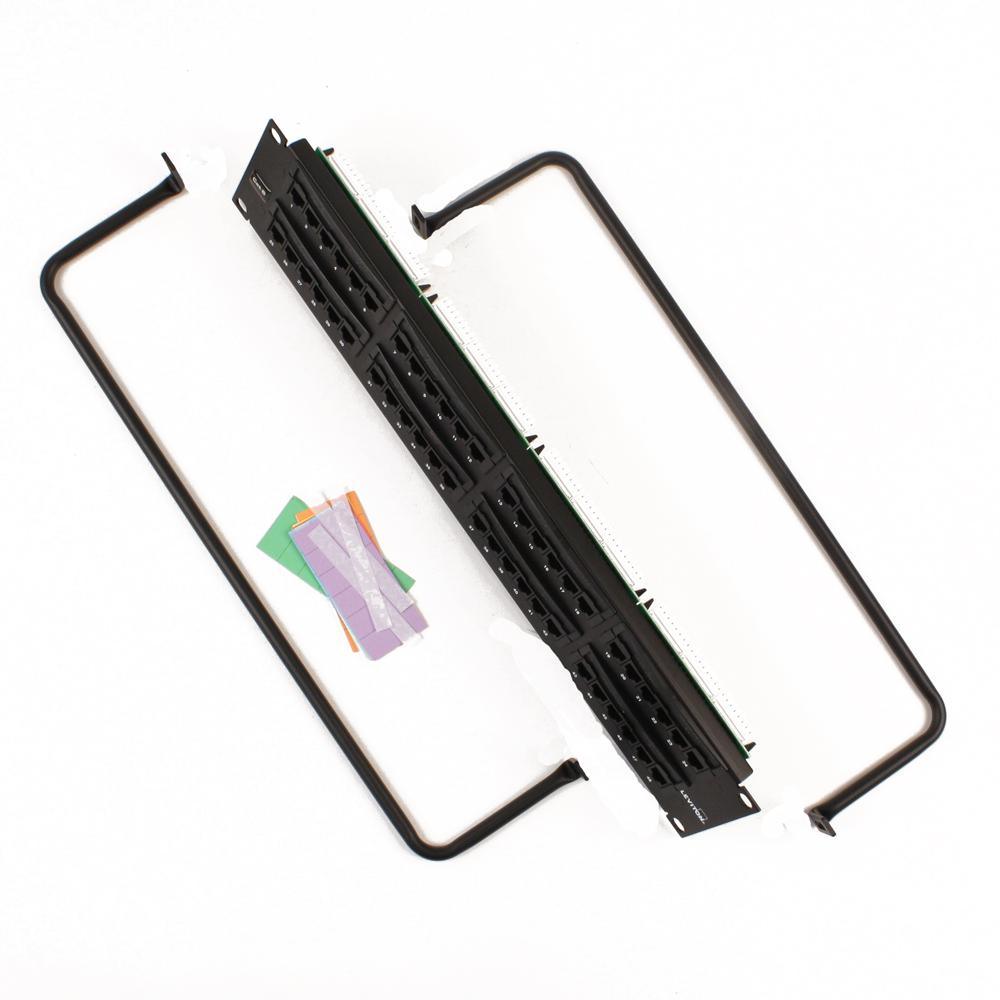 eXtreme 6+ Universal Patch Panel, 48-Port, 2RU, CAT 6. Cable management bar included. Leviton eXtreme 6+ CAT 6 Flat 110-Style patch panels are designed for use on 19 in. standard racks and cabinets. The patch panels include Leviton’s patented Retention Force Technology, which promotes consistent performance over the life of the system. Installer-friendly design allows for quick installation due to standard 110 terminations on the rear of the panel, which follow the normal installation color sequence (blue orange, green, brown) from left to right. The eXtreme 6+ CAT 6 system is designed for use in high megabit applications such as Gigabit Ethernet. Patented retention force technology protectstines from damage from 4- or 6-pin plugs Craft-friendly installation T568A and T568B wiring cards for 110-style IDC terminations Color-coded front labeling for easy port identification (TIA-606-A compliant) Grounding standoff for optional earthling/grounding Terminates 26-22 AWG solid conductors Capable of multiple determinations.