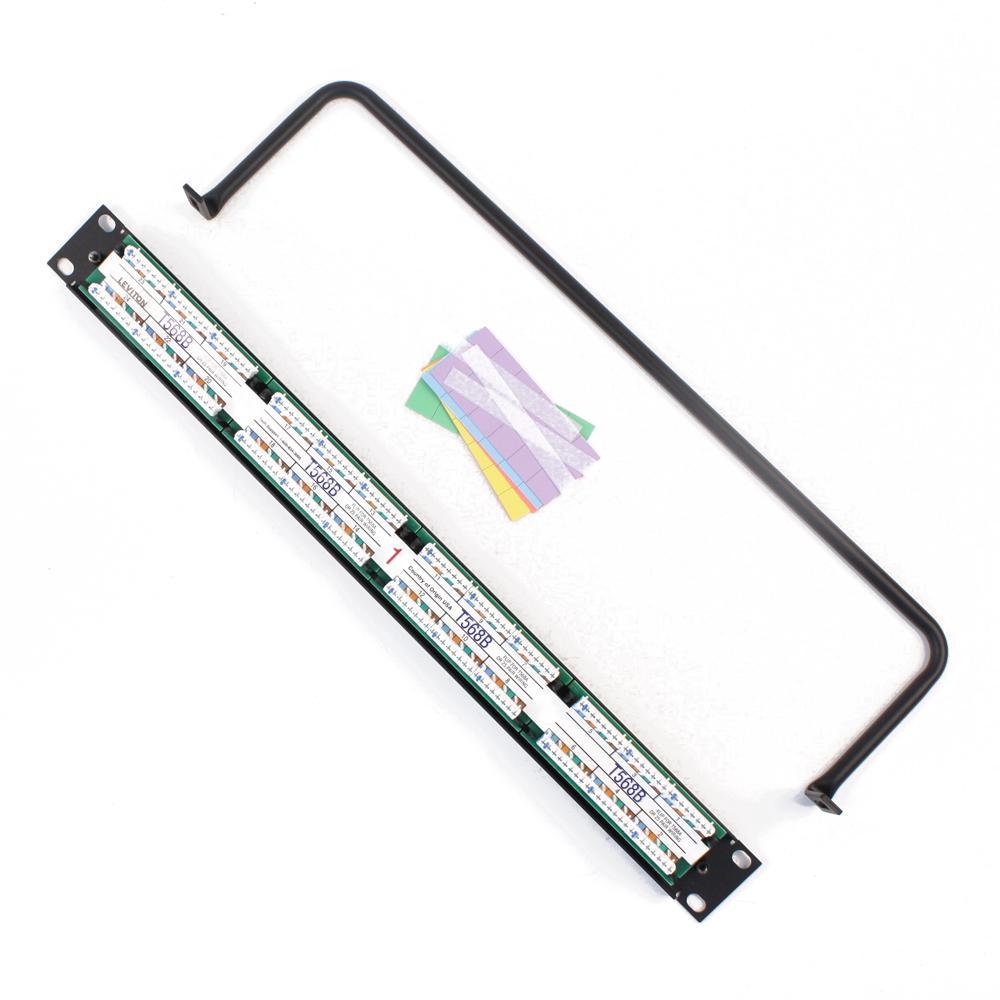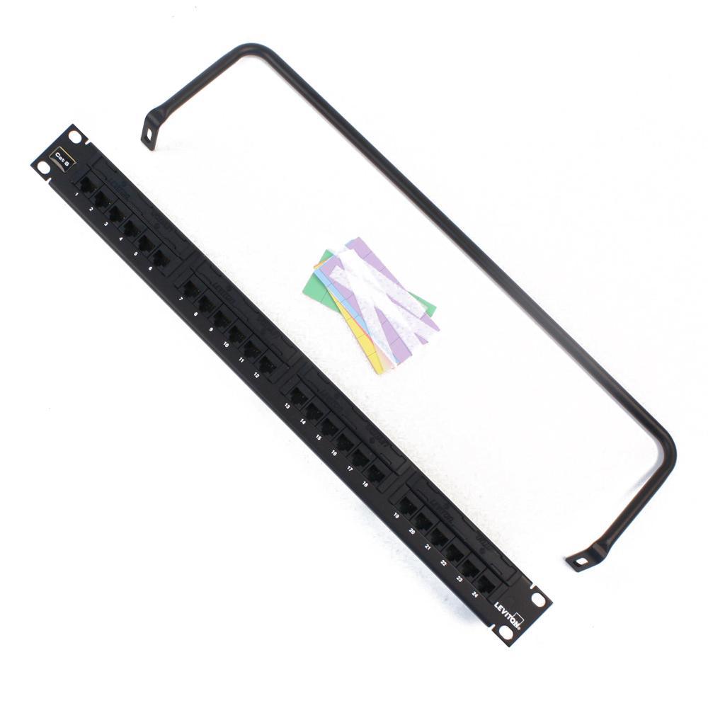 eXtreme 6+ Universal Patch Panel, 24-Port, 1RU, CAT 6. Cable management bar included. Leviton eXtreme 6+ CAT 6 Flat 110-Style patch panels are designed for use on 19 in. standard racks and cabinets. The patch panels include Leviton’s patented Retention Force Technology which promotes consistent performance over the life of the system. Installer-friendly design allows for quick installation due to standard 110 terminations on the rear of the panel, which follow the normal installation color sequence (blue orange, green, brown) from left to right. The eXtreme 6+ CAT 6 system is designed for use in high megabit applications such as Gigabit Ethernet. Patented retention force technology protectstines from damage from 4- or 6-pin plugs Craft-friendly installation T568A and T568B wiring cards for 110-style IDC terminations Color-coded front labeling for easy port identification (TIA-606-A compliant) Grounding standoff for optional earthling/grounding Terminates 26-22 AWG solid conductors Capable of multiple determinations.