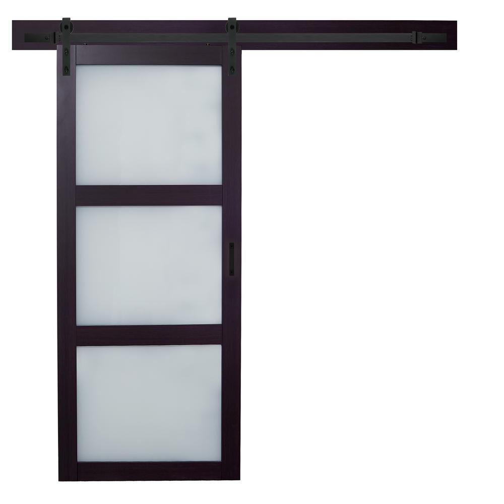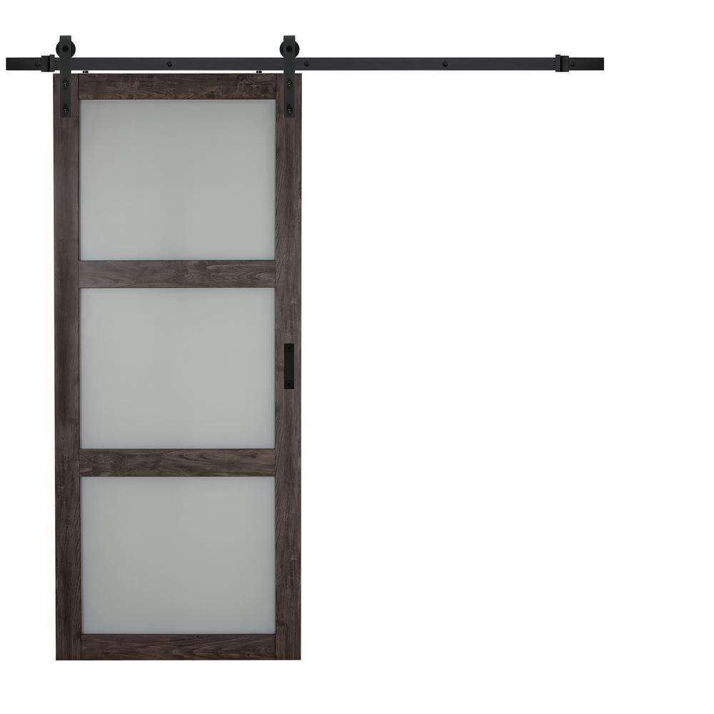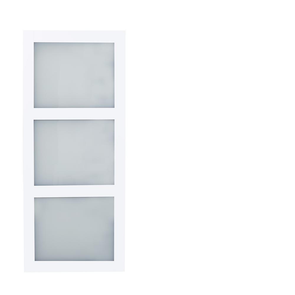 36 in. x 84 in. Bright White Solid Core Frosted 3 Lite Barn Door with Rustic Matte Black Hardware Kit
