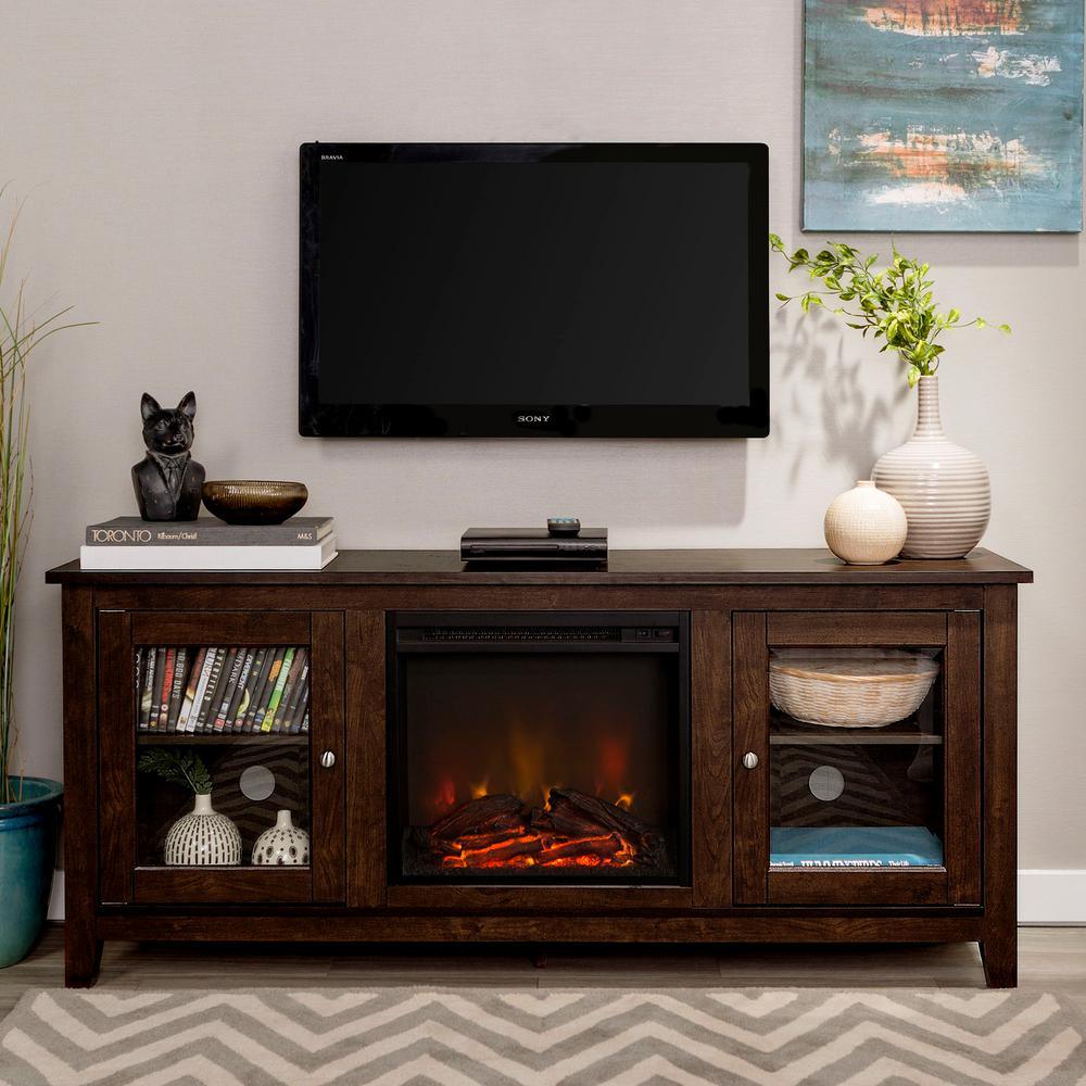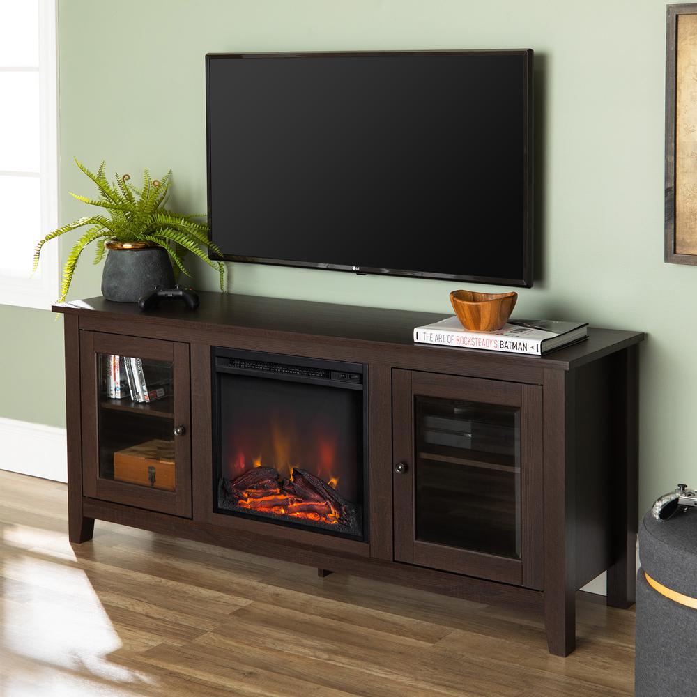 Give your home that traditional feel and extra storage space it needs with our TV stand with an electric fireplace. The electric fireplace of this console is front and center for a warm and enjoyable time while watching TV or reading a good book. It’s easy to set up and doesn’t require an electrician, as it’s a simple plug-in unit. With the flip of a switch, you’ll have a gorgeous faux log display with heat. Side cabinets feature tempered safety glass, so you can see your items on the shelving inside. These cabinets give you a place to store anything from your movies and electronics, to your books and decor. The combination of manufactured wood and glass give this entertainment center a homey feel to your living room or bedroom.