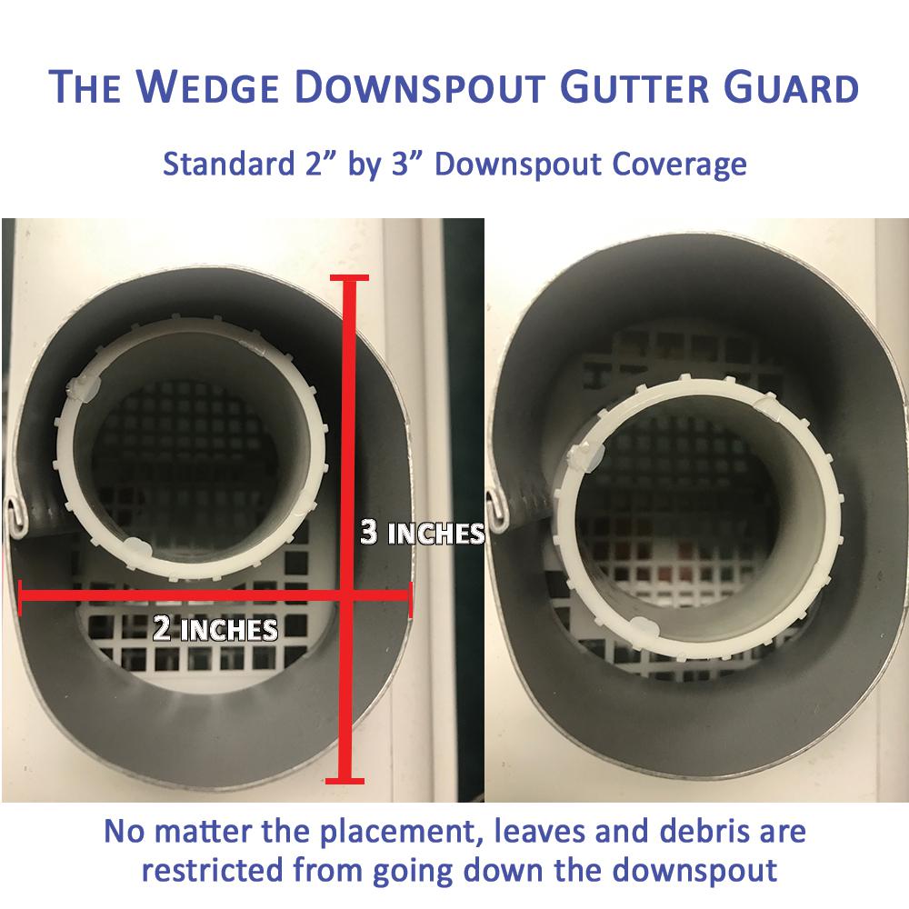 Downspouts on your home or business will be free of debris when you place The Wedge Downspout Gutter Guard where the downspout and the gutter meet. Allows water to flow right through, but collects debris to keep downspouts clear. Install The Wedge into your gutter downspout for clog free gutters. If you have a downspout in the middle of your house or building, use the connecting pegs that are attached to The Wedge to snap two Wedges together. Remove the cylinder of one of The Wedge and place The Wedge with the cylinder into the middle downspout; this protects the downspout from both sides. For corner downspouts, simply place one Wedge into the downspout to prevent downspout clogs.