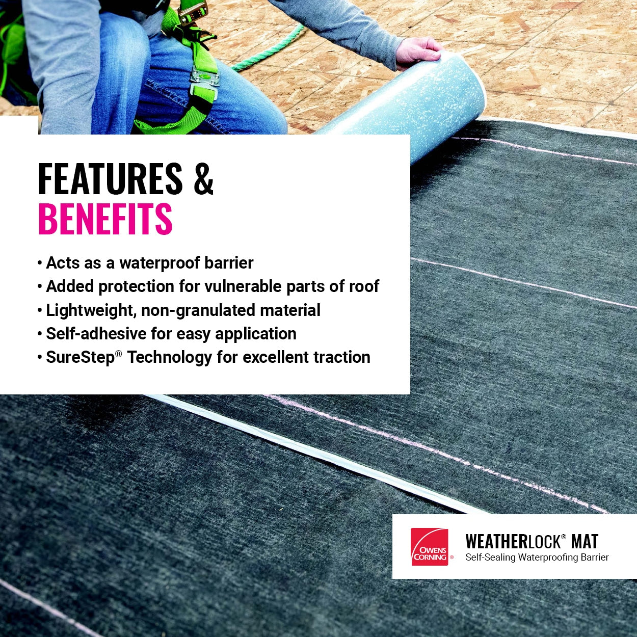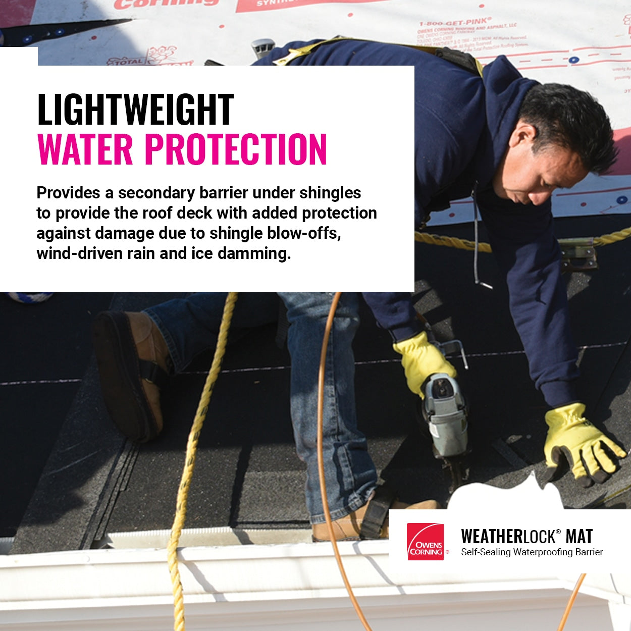 Lightweight, self-sealing roof underlayment designed to add a waterproof layer beneath shingles. The WeatherLock Mat roll covers 200 sq ft and features SureStep technology for improved traction and easier installation.
