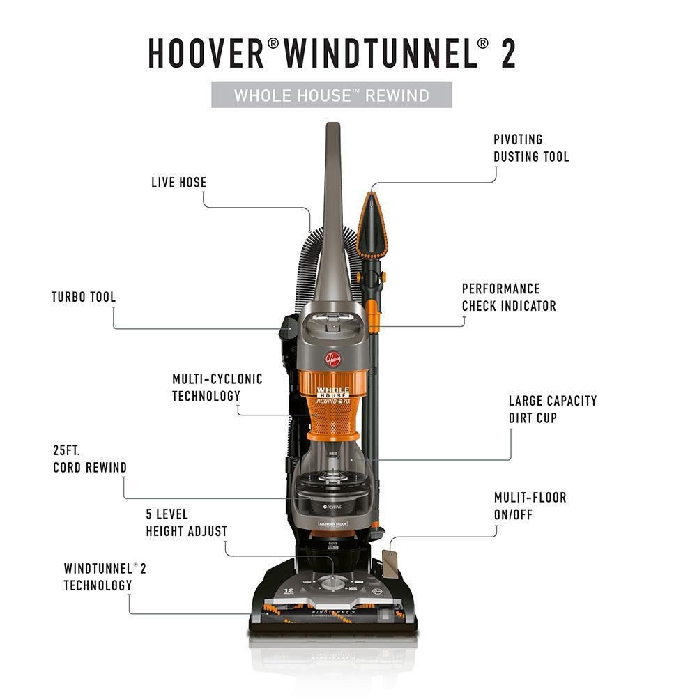 Hoover WindTunnel 2 Whole House Rewind Pet is perfect for Whole Home Cleaning from Floor to Ceiling. The Multi-Floor Brush Roll allows you to turn the brush roll on for optimal cleaning on carpets and off to prevent scattering of debris on hard floors for a more effective clean. Advanced Multi-Cyclonic Technology gives you a continuous cleaning experience with No Loss of Suction, while WindTunnel 2 Technology creates 2 channels of suction to lift and remove surface debris and deep down embedded dirt. The hassle-free 25 ft. power cord automatically retracts in seconds, so you never have to wrap a cord again and with up to 16 ft. of cleaning reach you can clean dirt and dust anywhere. Advanced AllergenBlock Technology, HEPA Media Filter, odor-absorbing carbon and Pet Turbo Tool make WindTunnel 2 Whole House Rewind great for pet owners. Based on ASTMF1977 using particle sizes down to 0.5 microns picked up from your vacuum. Per IEC 60312-1 1st Edition, Clause 5.9. Test results within accepted variability tolerance of 5%.
