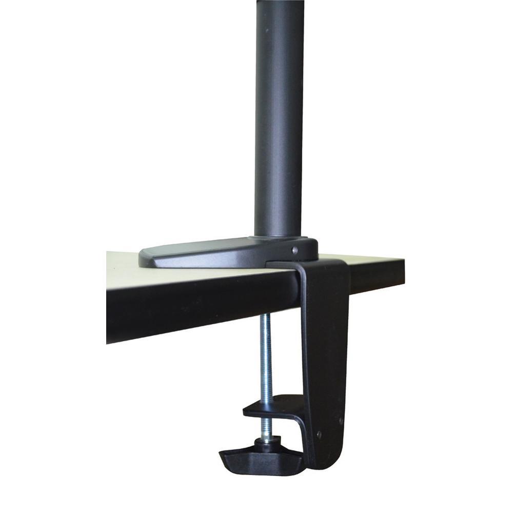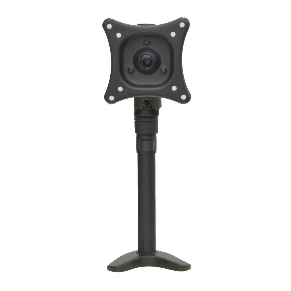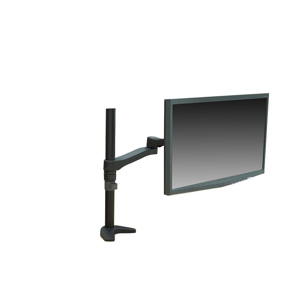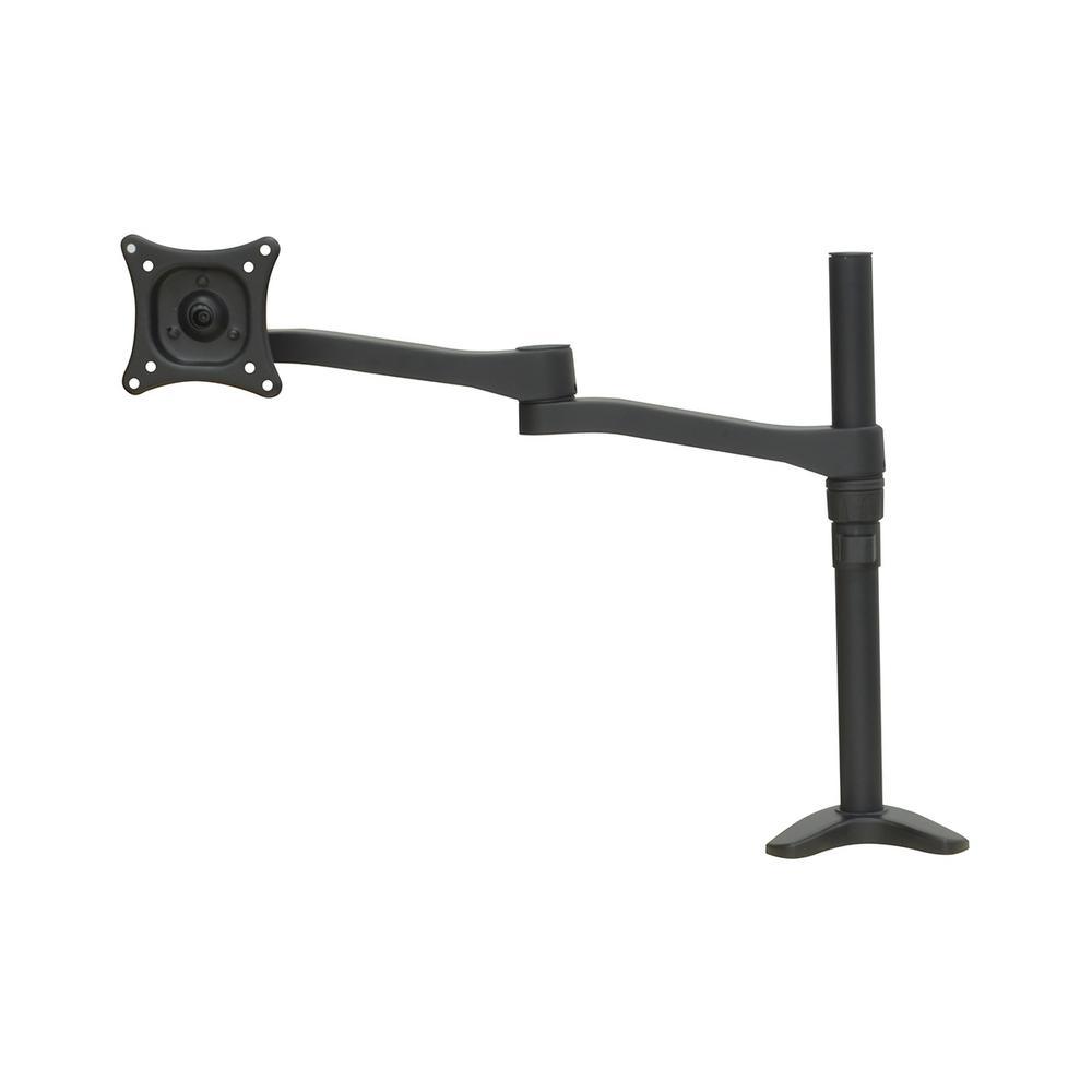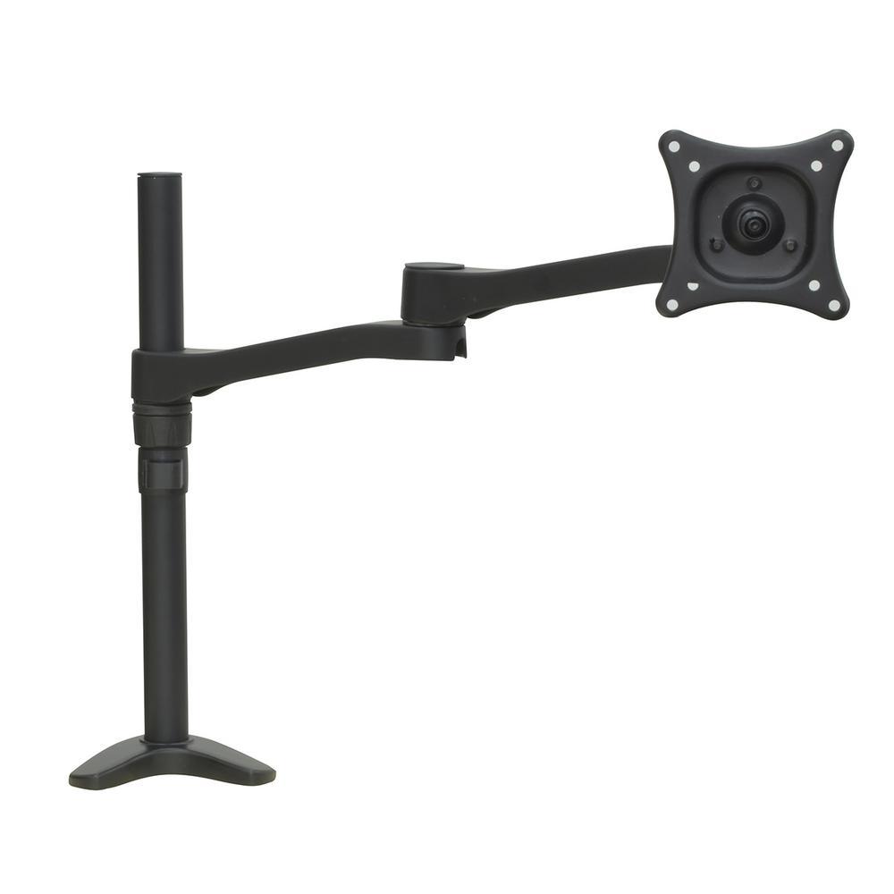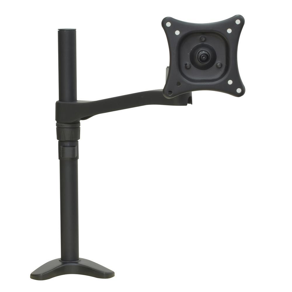 Regency's Single Articulating Monitor Mount provides a customized display option for a single screen. Tilt, pan, height and swivel adjustments ease stress from straining to see a monitor that is too high, too low or at the wrong angle. Its sturdy metal base and articulating arm are finished in a matte black to compliment any decor and desk finish. Wire management clips around the base keep cords neat and tidy and work surfaces clear. The Mount attaches to virtually any desktop with either a clamp or grommet and accommodates most 12 in. to 24 in. screens. Regency Monitor Mounts are backed by a five-year limited manufacturers warranty.