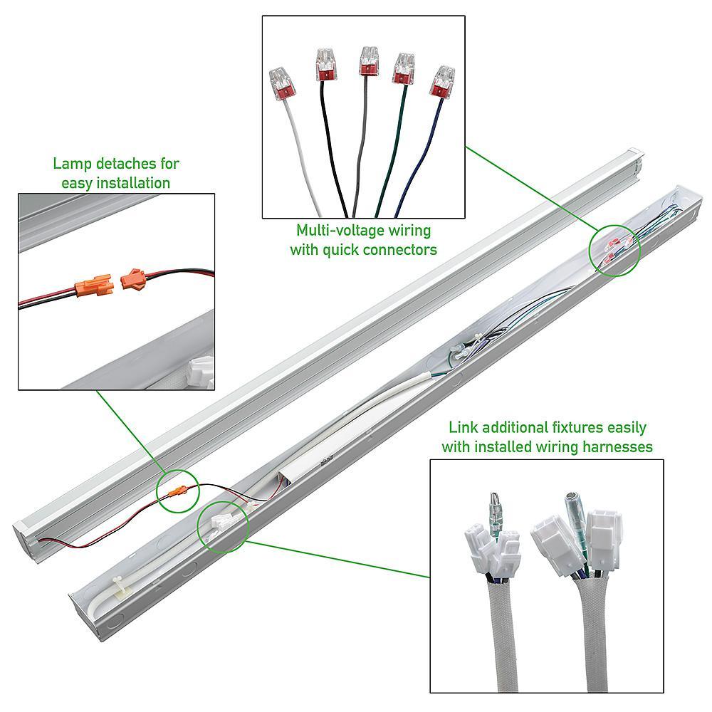 ETi's 4 ft. Linkable LED High Output Strip Light replaces outdated, buzzing and glaring fluorescent tubes with a cool energy-efficient LED fixture. You have the option to install as direct wire or plug-in and is linkable up to 10 fixtures on one electrical connection. This fixture emits powerful high output 5000 Lumens of brightness with 5000K Daylight light output using only 45-Watts of electricity. This replaces (3) 32-Watt T8 fluorescent tubes with premium LEDs and Energy Star rated savings reducing your monthly utility bills. It has a durable impact resistant lens and can be installed flush with ceiling or as pendant. Ideal for workshops, garages, utility rooms, storage units, hallways, office, retail store aisles, restaurants, schools, hospitals and hotel/motel locations.
