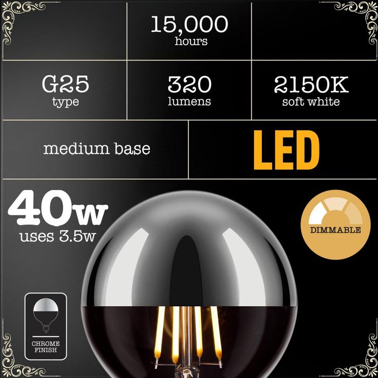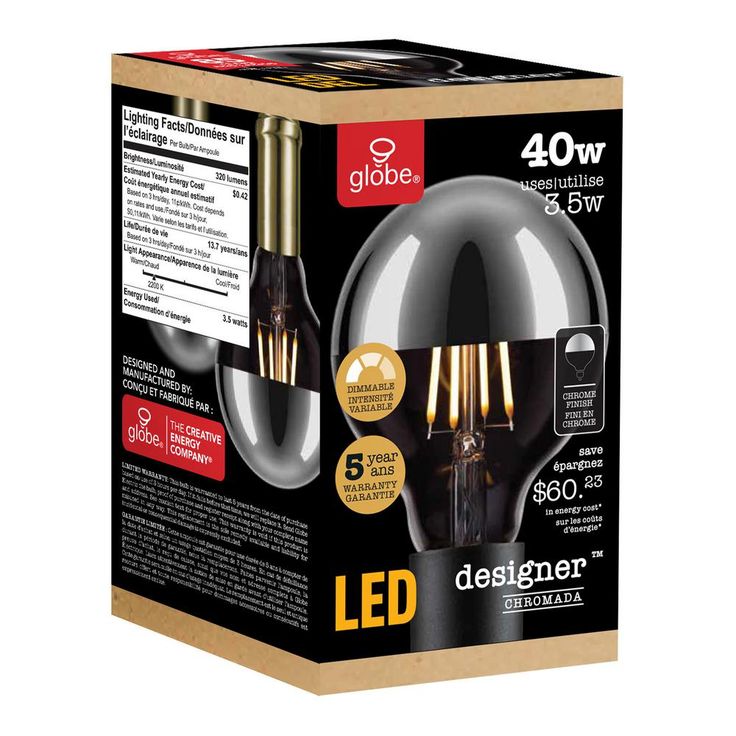 Regular price $15.07Globe Electric's Designer Chromada 40W Equivalent Soft White (2200K) Dimmable Medium Base LED Bulb has a chrome tipped top to help direct the light and to beautifully reflect its surroundings. A perfect accent light, position it within an exposed socket pendant or fixture to enjoy its shape and ambient glow. Crafted to preserve the look of early 20th century lighting, Globe Electric's Designer Chromada LED Light Bulb is a perfect way to liven up a room. Globe Electric's LED bulbs are a great way to update your home and make it green. Energy cost per-year is only $0.42 when you use it for 3-hours a day. LED’s are very environmentally friendly, turn on instantly, are very durable, not prone to failure and emit very little heat.