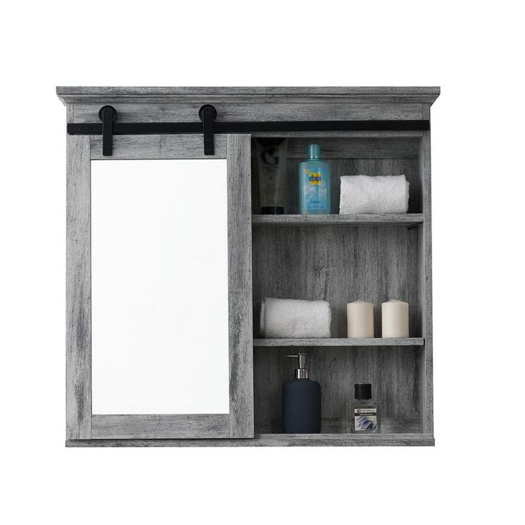 The Glacier Bay 29 in. x 31 in. Medicine Cabinet has an all wood case with a stylish Washed Gray finish. As functional as it is stylish, this trendy barn door cabinet has 2 adjustable wooden shelves for plenty of storage and a mirror on the sliding door. Easy to install with a hanging kit included, this cabinet is surface mounted and will provide years of use and enjoyment.