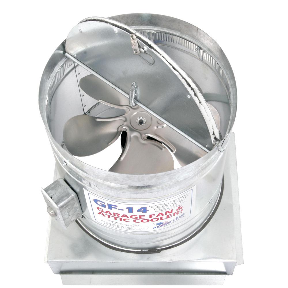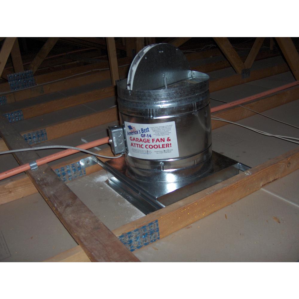 The GF Series Garage Ventilation Fans keep your garage cooler. The GF-14 Garage Fan and Attic Cooler is designed to mount in the ceiling of the garage, venting to the attic. The GF-14 Garage Fan will cool the garage as much as 20 and help cool the attic as much as 40 or bring it closer to ambient temperature.