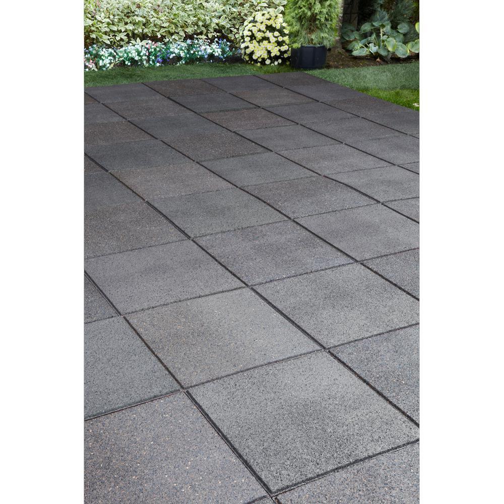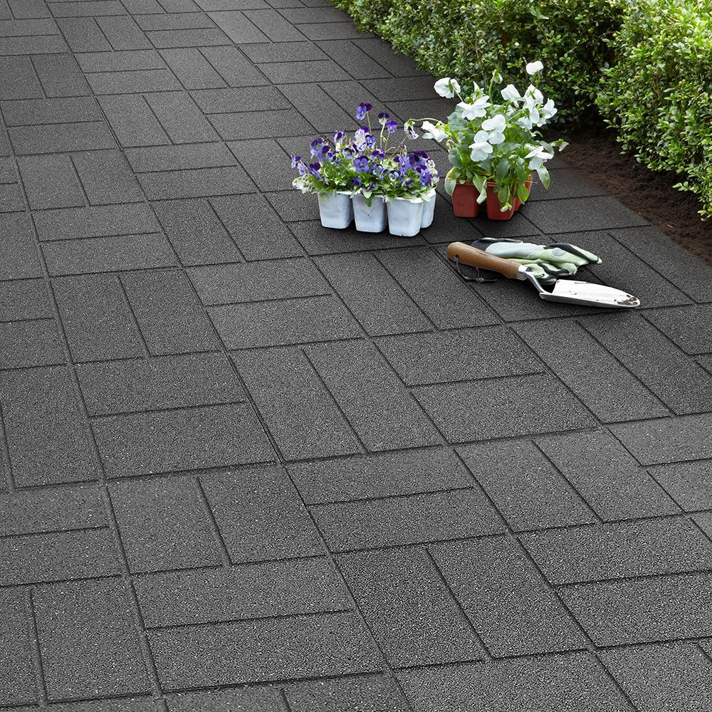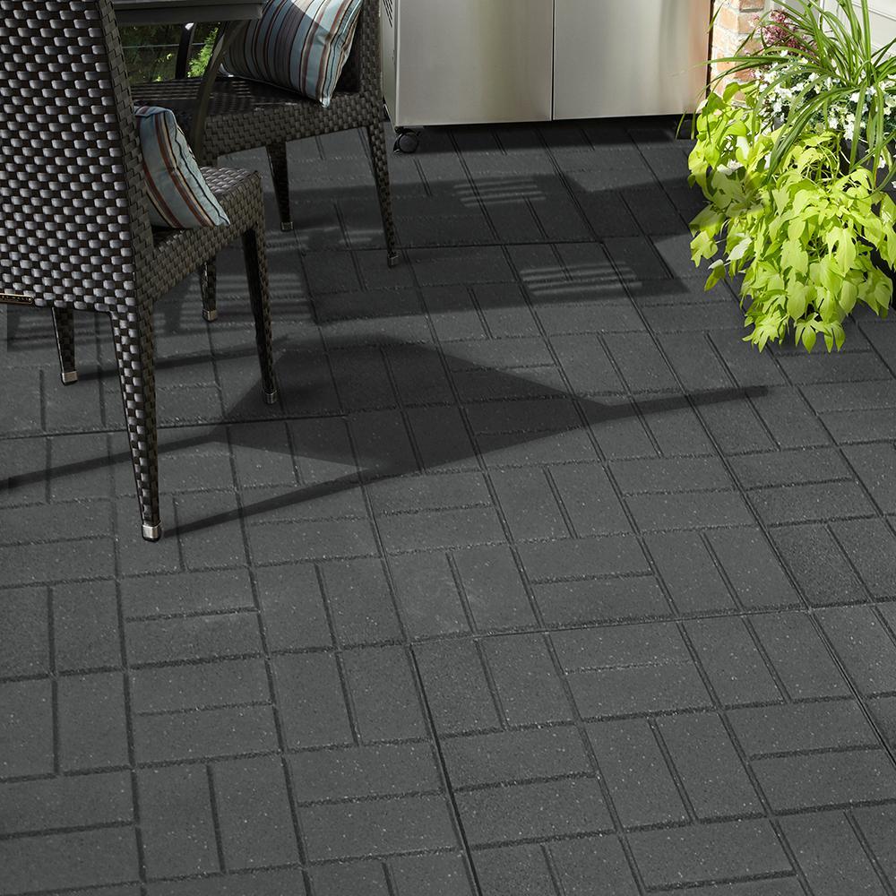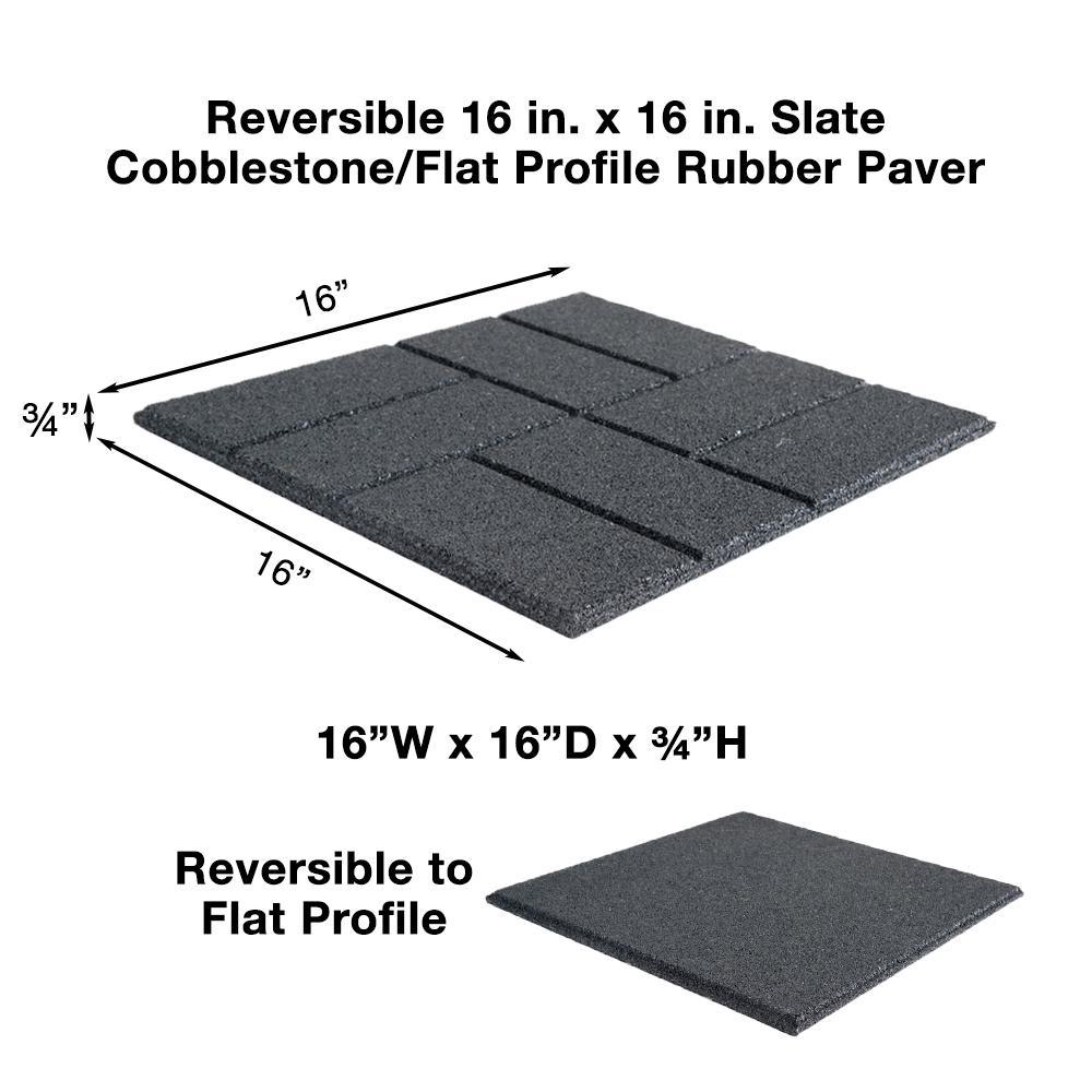 This product, the Reversible 16 in. x 16 in. x 0.75 in. Slate Brick Face/Flat Profile Rubber Paver, is made from 100% recycled rubber, saving approximately 3 million tires from being sent to the landfill. Due to the nature of recycled materials, each tile will have a unique color and size, with a maximum difference of 1/4 inch between tiles. The Envirotile is a floating floor system that allows for easy do-it-yourself installation on various hard surfaces, such as wood, concrete, and patio tiles. This investment is versatile and portable, as the tiles can be easily moved to a different location. Perfect for balconies, patios, decks, and child play areas, these tiles are reversible, transitioning from a traditional cobblestone pattern to a sleek, flat surface. Each tile weighs approximately 5.6 lbs., making it light enough to carry by hand but heavy enough to stay in place.