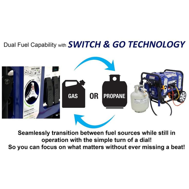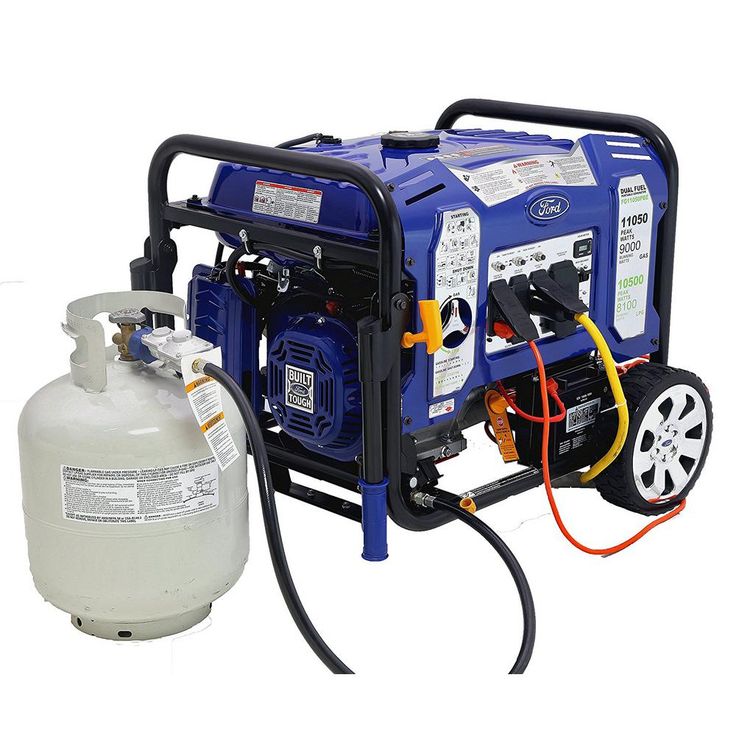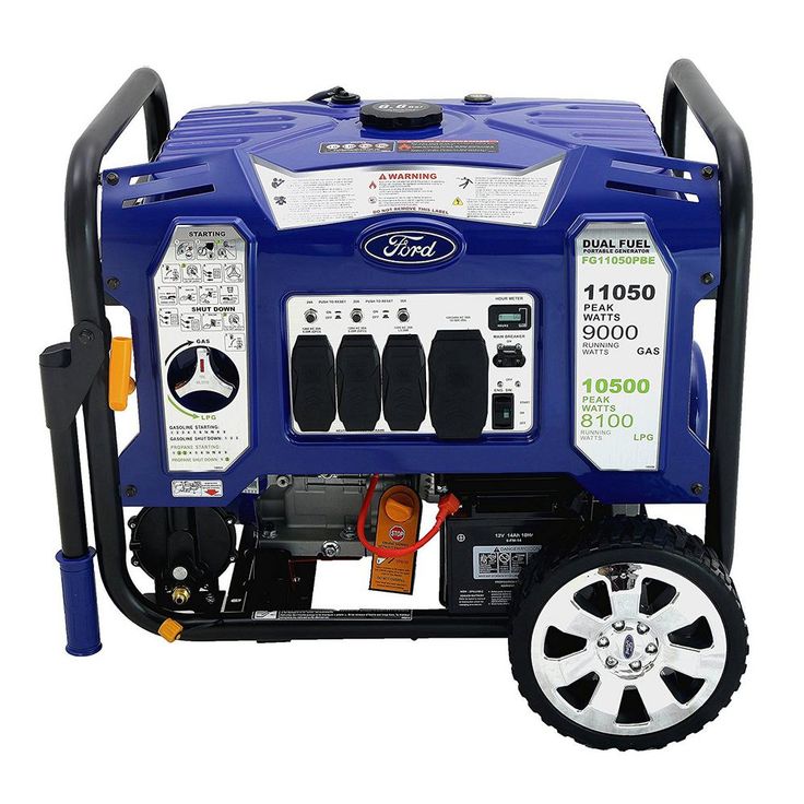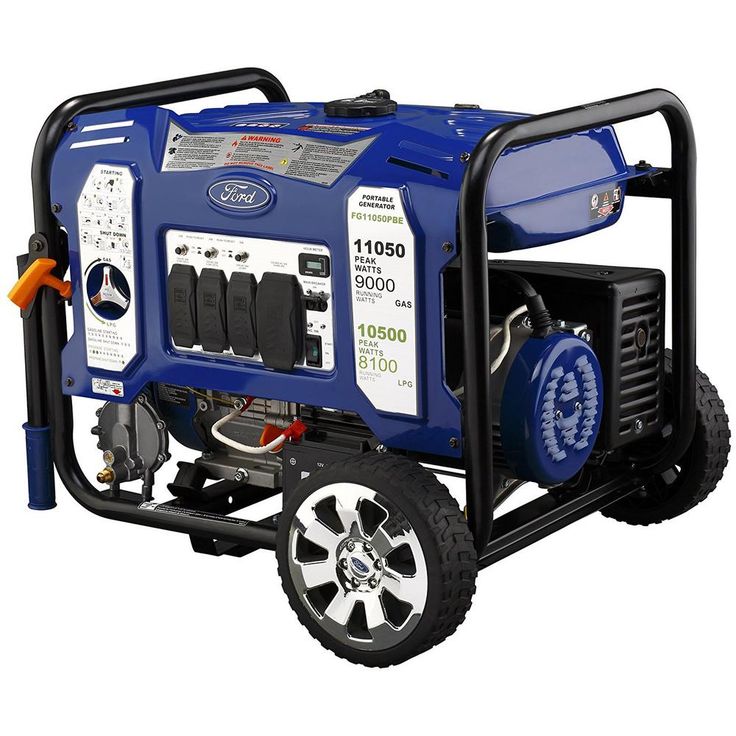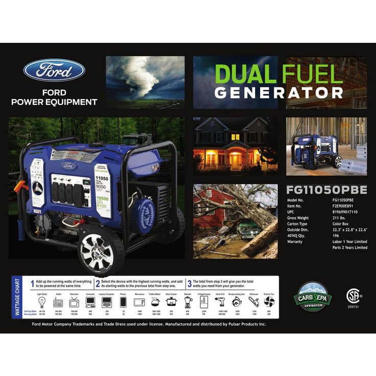 The performance of gasoline and the convenience of liquid propane in the same generator that includes 20 ft./lbs. of torque making it one of the most powerful engines in its product class, make the Ford FG11050PBE a serious contender for both daily use and/or storm related emergencies. Everything from the simple push-button, electric start of the 457 CC, CARB compliant, EPA and CSA certified engine to 6 different outlets for everything from 120V to 240V for up to 9.5 hours at half load have been designed with 1 goal in mindpeak performance. The Ford FG11050PBE has the ability to switch from gasoline to clean, safe, convenient LP with its patented flip-of-the-wrist Switch-N-Go technology, even when the unit is operating, makes this unit an absolute must in times of energy need. Created to power up to 5 major appliances at one time, the Ford FG11050PBE includes 10" no-flat, foam-filled pneumatic tires, fold-down dual handles and digital hour meter, along with GFCI outlet protection with weather beater rubber covers a plus patented an easy-to-read top-mounted, gas gauge that all combine to give credence to the Built Ford Tough warranty pledge of 2 year parts and 1 year labor that just marks the beginning of years of loyal and dedicated service.