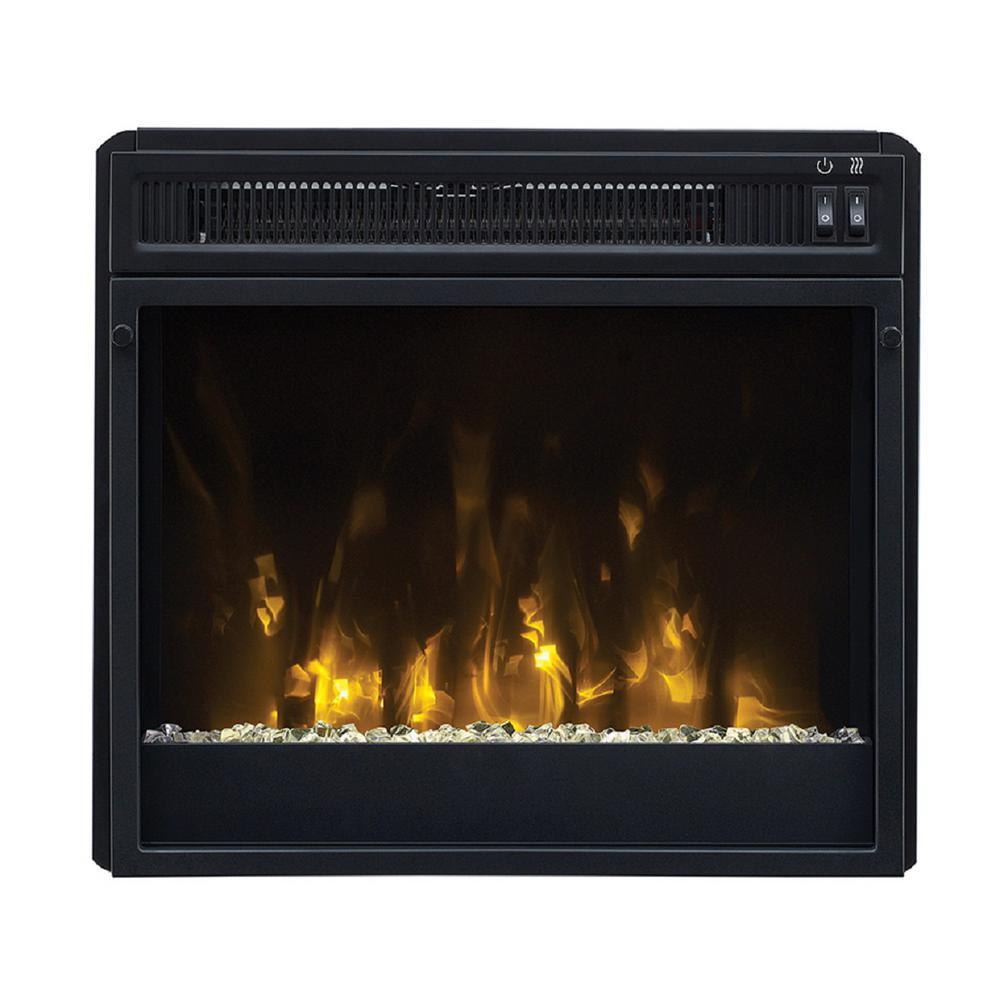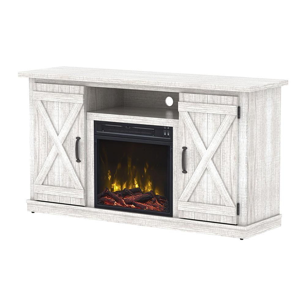 Embodying all the charm of country inspired decor, this TV stand will be a standout piece in any room. An open center shelf holds media components and gaming consoles. The cabinet doors and top tout a plank design while the doors are decorated with X mullions. The side cabinets with adjustable shelves provide storage for electronics and accessories. Use the electric fireplace to create a stunning focal point while warming up to 400 sq. ft. The flame effects can be used with or without heat for year-round ambiance. Choose between included contemporary fire glass media or a realistic log set and ember bed to showcase the beautiful flames. This TV stand accommodates most flat screen TVs up to 55 and up to 45 lbs. The 18 Classic Flame slim line insert ships as a set with this TV stand as a small parcel.