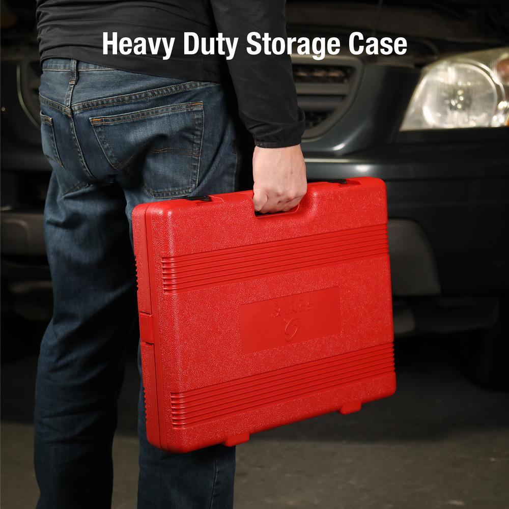 Have the best tools for any job with the Sunex 2568 1/2 in. Drive Master Impact Socket Set. Each socket is forged from Cr-Mo alloy steel, designed with radius corners, made with chamfered openings, and marked by laser etching and roll stamping for permanent socket identification. The set includes SAE sizes from 3/8 in. to 1-1/2 inches in standard and deep lengths along with four impact extensions and a universal joint. The set meets ANSI Standards and is backed by a lifetime warranty.