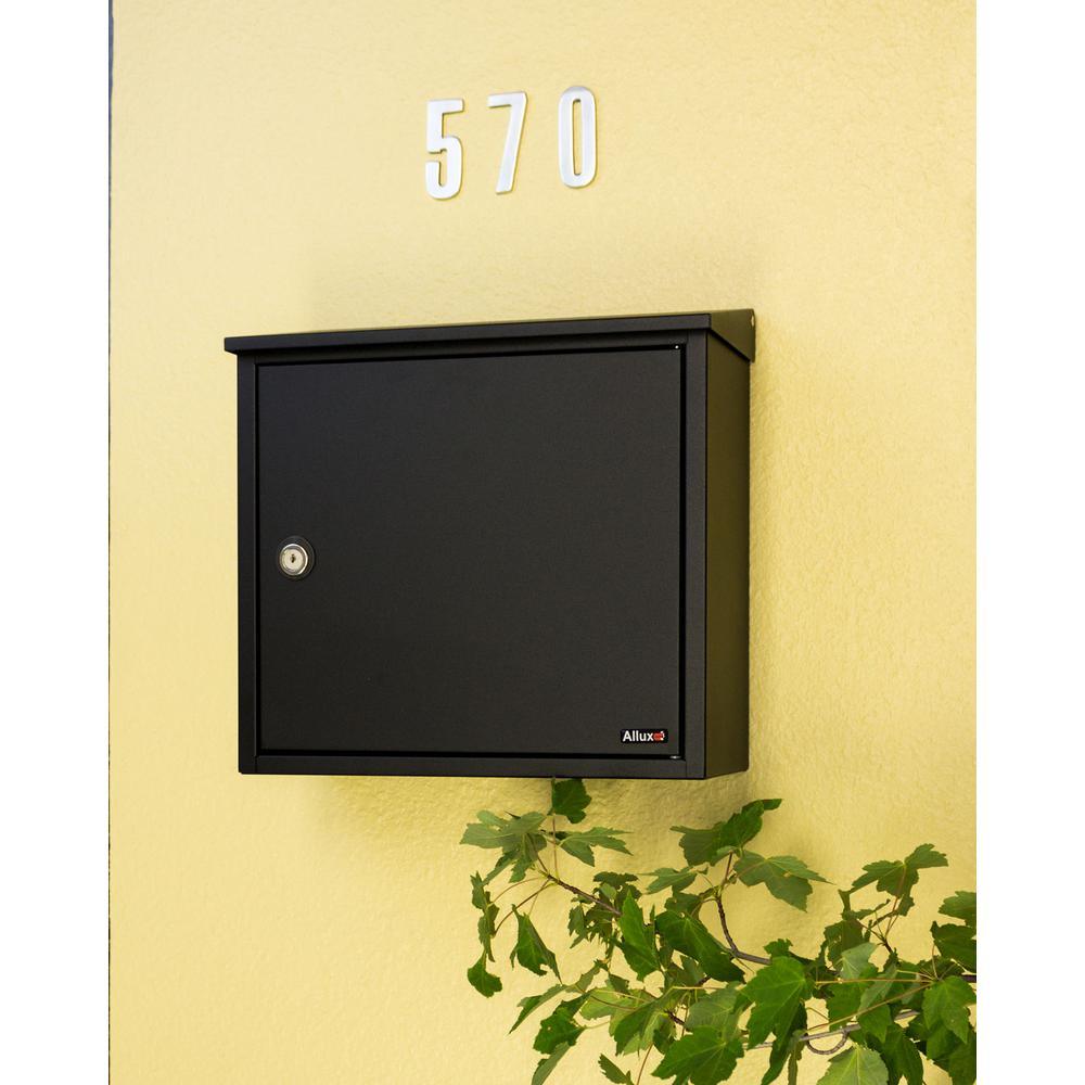 Allux 400 Wall mount mailbox is a rich and roomy, top-loading locking mailbox. A top lid covers the 12-3/8 in. x 1-3/8 in. incoming mail slot. Steel construction with a durable powder coat finish. Interior: H 10.5 in. x 13.5 in. x 5 in.