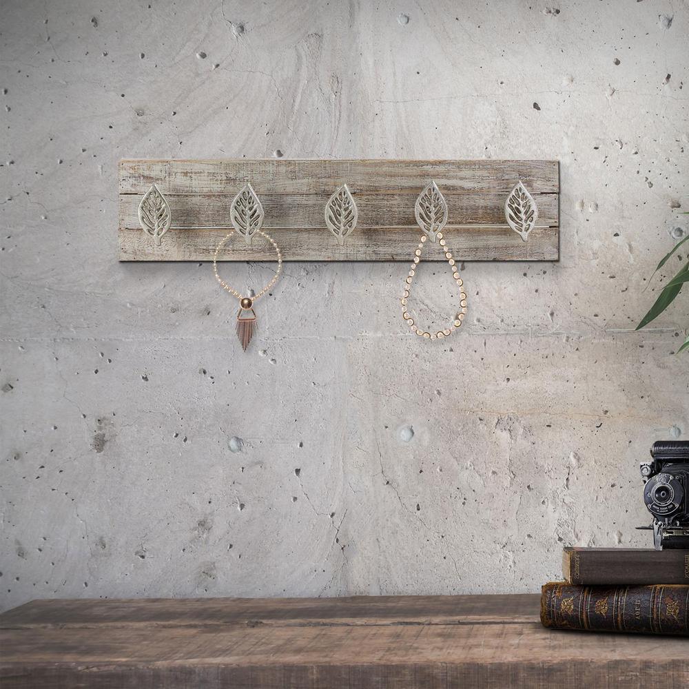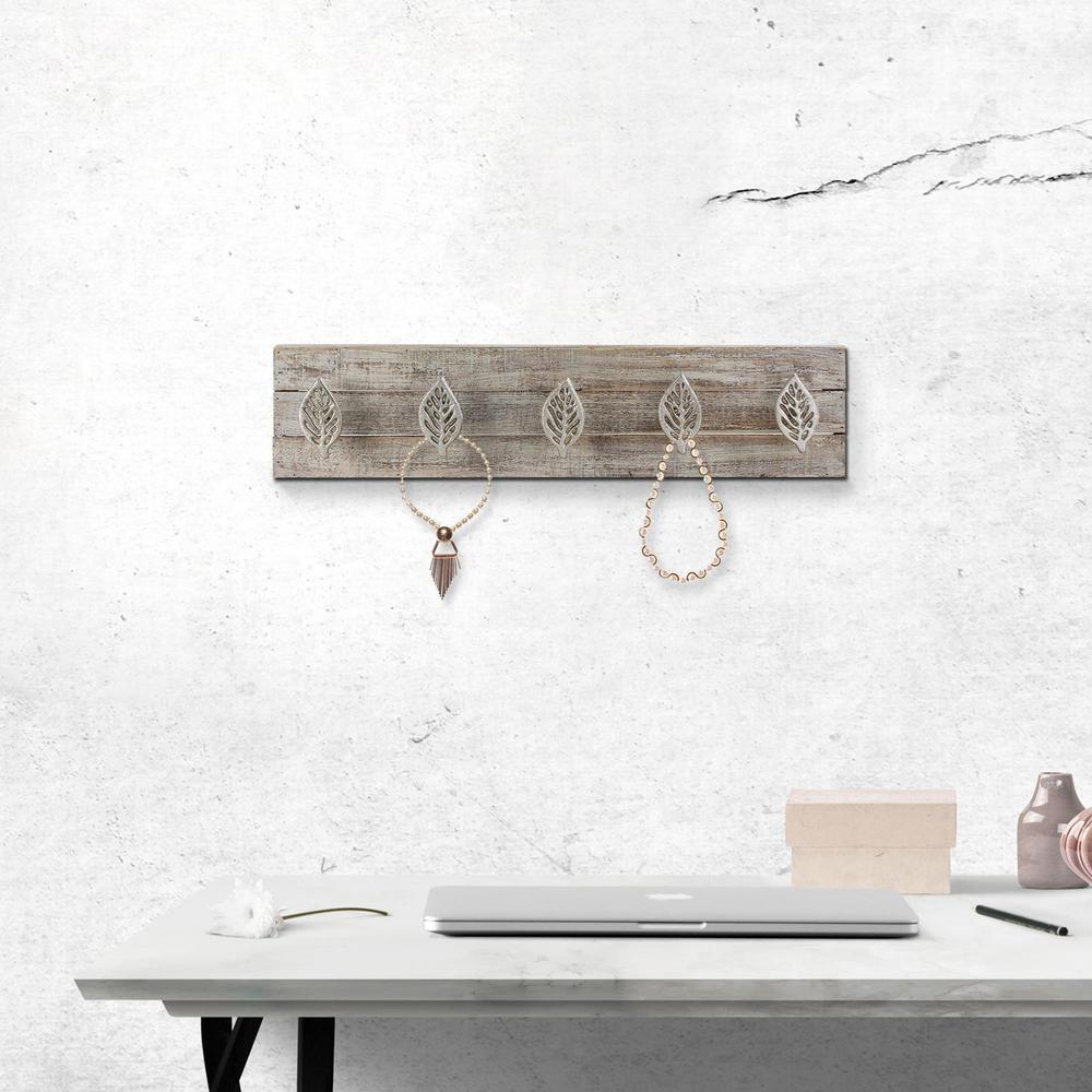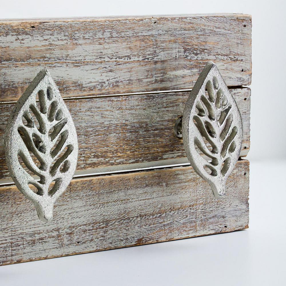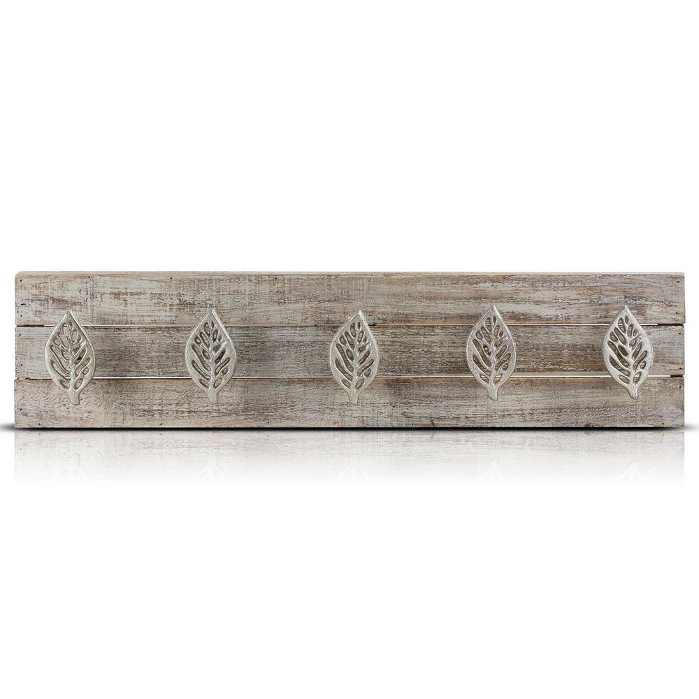 Hang up the day onto this shabby-chic, vintage-inspired wood and metal coat rack. Outfitted with five intricate, silver-colored leaf hooks that contrast perfectly against three panels of distressed wood, this stylish coat and bag rack is a perfect example of farmhouse decor. The piece is laden with a weathered wear-and-tear look from the natural wood, while the clean and more modern fixtures offer a more sleek and sophisticated balance, giving it a well-rounded and cohesive farmhouse design. Lightweight and easy-to-hang, this rack doesnt just have to live in your entryway when you come home, it can work in your kitchen, bathroom, bedroom, or anywhere else you may need extra hanging solutions. From aprons and grocery bags to extra totes, coats and towels, you have lots of options as to where you find a home for this piece. Well leave that part up to you and your imagination. Add a rustic touch to your home decor with a stylish, smart and staple piece that provides great function and form.