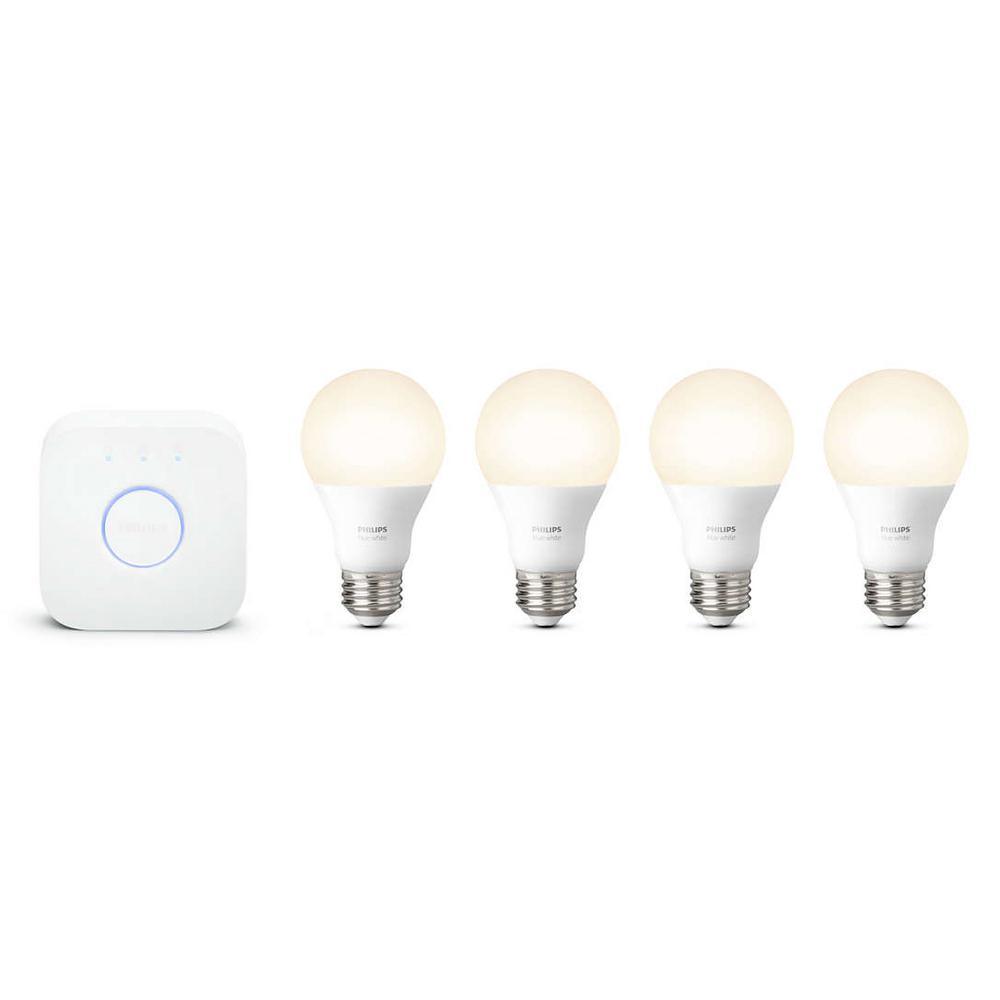 Kickstart whole‑home smart lighting with four Philips Hue White A19 dimmable LED bulbs and the Hue Bridge. Control lights via app, voice, or schedules and enjoy warm-to-cool white ambiance with 60‑W equivalent brightness in standard E26 sockets.