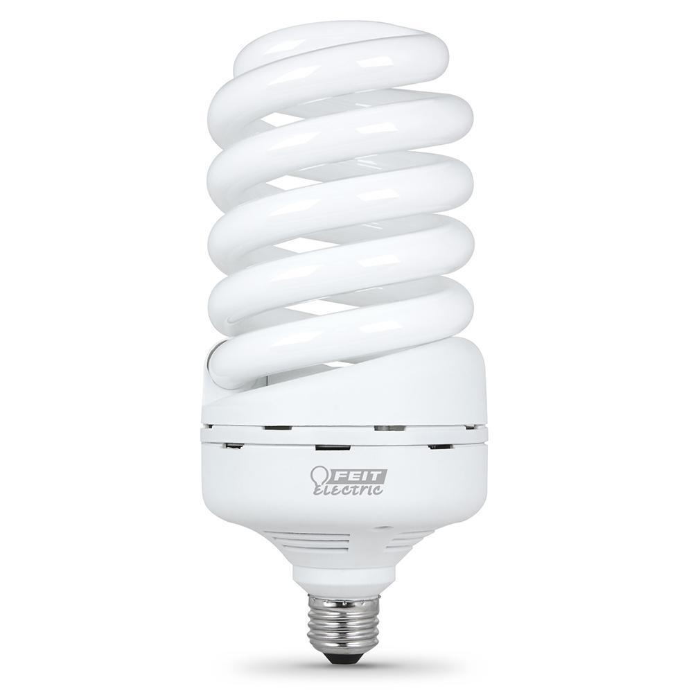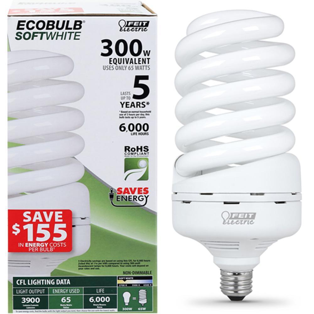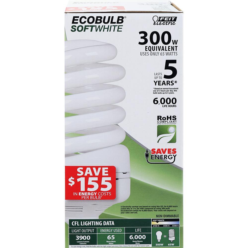 This indoor/outdoor general household lighting CFL light bulb from Feit Electric puts out a substantial 3900 lumens of soft white (2700K) light to beautifully illuminate interior and exterior settings. The 65-Watt compact fluorescent lamp turns on instantly without flickering and uses considerably less electricity than its 300-Watt incandescent equivalent, using only an estimated yearly energy cost of $7.83. The medium base on this Ecobulb Plus lamp fits standard-sized light sockets for easy installation in most household fixtures.