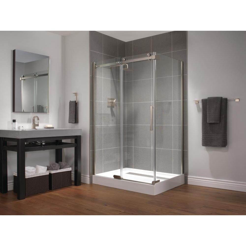 This 36 in. x 48 in. Single Threshold Corner Shower Base in White and 48 in. x 76 in. Frameless Sliding Shower Door in Stainless with 36 in. x 76 in. 1-Piece Direct-to-Stud Corner Shower Glass Panel in Stainless are designed to fit 36 in. x 48 in. alcoves. Offering style and design, this bright white shower base matches porcelain finishes. The high gloss, acrylic surface is easy to clean and resists mold and mildew. The shower base is reinforced for durability. The sturdy top guide system provides support, a smooth operation and a quiet close. The sliding safety tempered clear glass door can be installed to open to the right or left. Perfect for tile applications and bathroom upgrades, the sleek design of this frameless door will complement any decor. Creates a luxurious corner shower that is as stylish as it is functional. Its interior flush mount hinge design makes quick work of cleaning this beautiful glass panel.