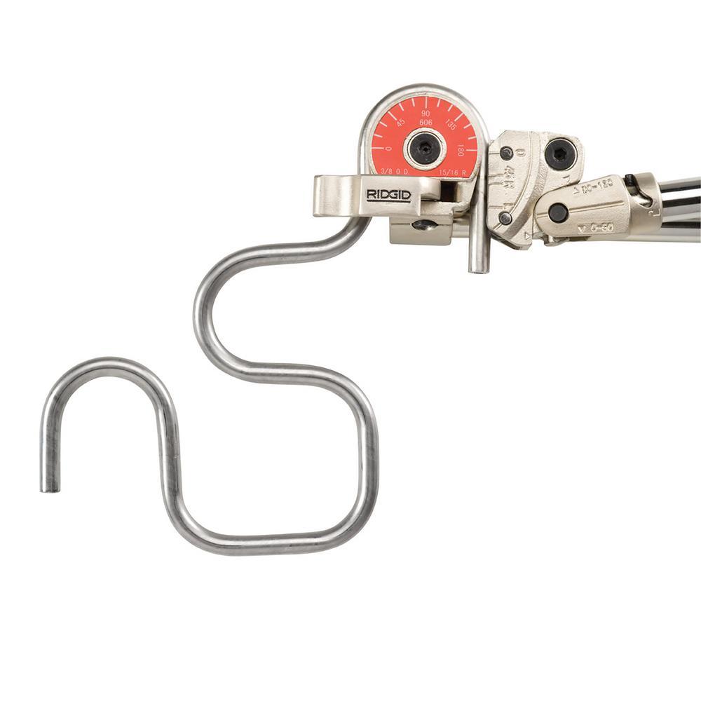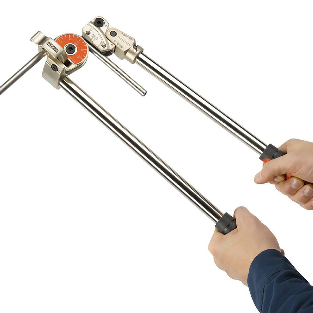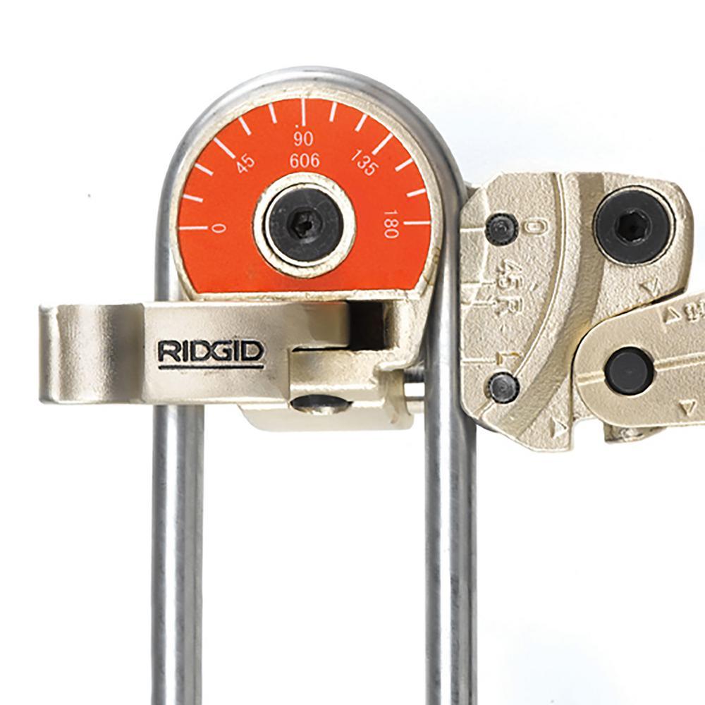 Designed for accurate and easy bending of hard metal tube, the RIDGID Model 606 Heavy-Duty Tube Bender produces high quality bends with much less effort when compared to conventional benders. The tubing bender easily bends materials such as stainless steel, steel and titanium to a maximum of 180 degrees. Made to keep bends in-plane and accurate, it features a simple 2-stage design that allows for bends from 90 to 180 without ever crossing handles. Users can easily lock and unlock the tube bender with a half-turn rotation of the bending handle. For improved accuracy, roll dies in the bending carriage reduce tube flattening (ovality) and the amount of force needed, while gain marks on the front ensure properly aligned bending angles. For reduced force, a vise clamp built into the bending form delivers extra stability and extra-long 16 in. handles offer increased leverage. Handles also feature cushioned grips for improved comfort and ease when forming bends. The tubing bender displays measurements in both inches and metric sizes. This pipe bender accommodates tubes with an outside diameter of a 3/8 in. and 15/16 in. bend radius.