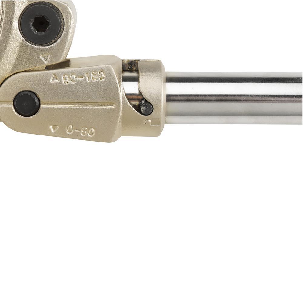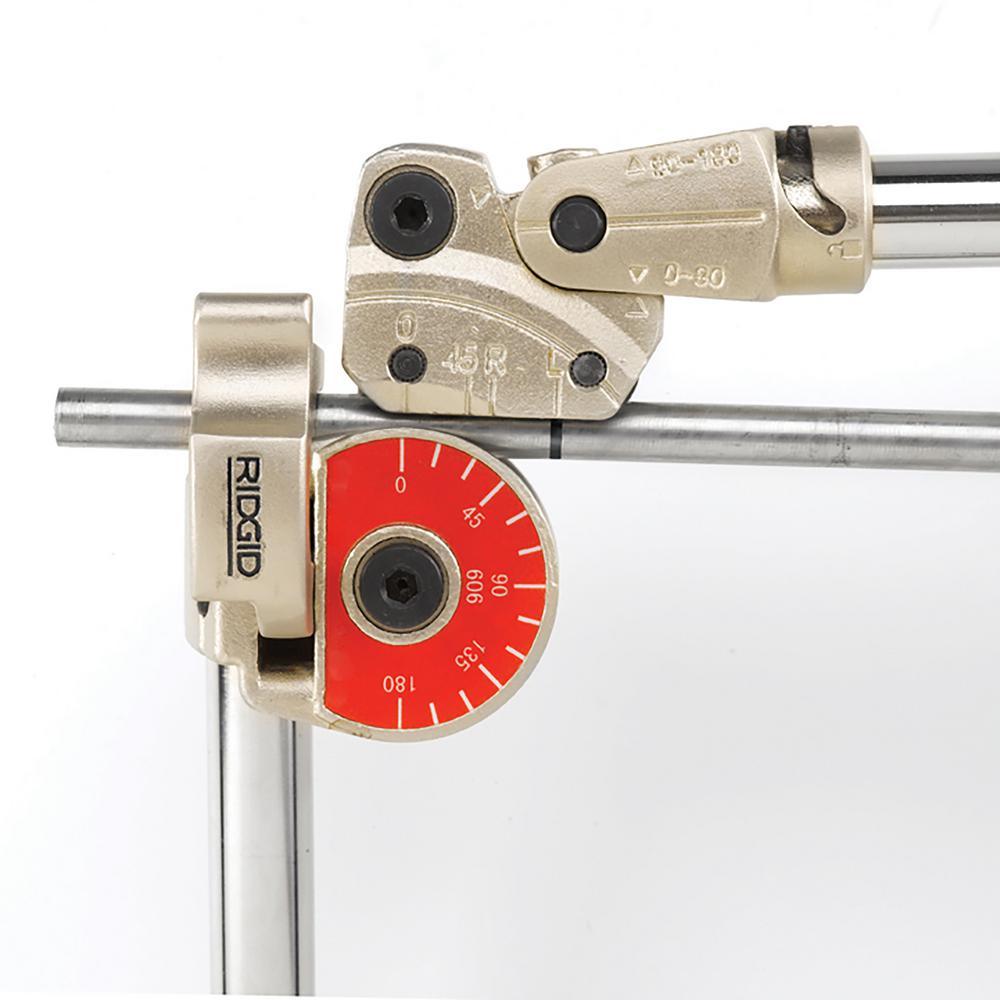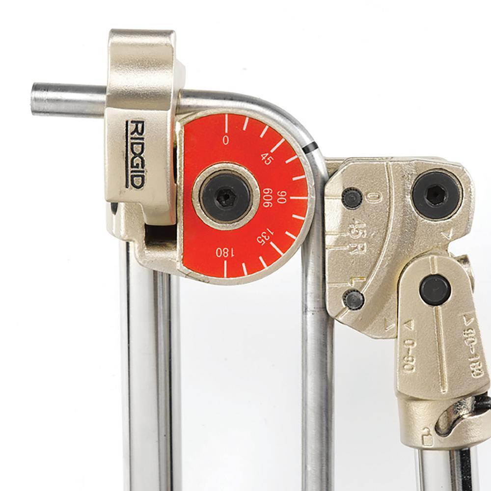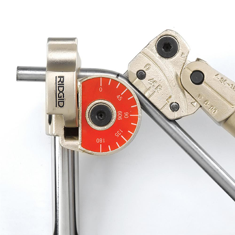 Designed for accurate and easy bending of hard metal tube, the RIDGID Model 606 Heavy-Duty Tube Bender produces high quality bends with much less effort when compared to conventional benders. The tubing bender easily bends materials such as stainless steel, steel and titanium to a maximum of 180 degrees. Made to keep bends in-plane and accurate, it features a simple 2-stage design that allows for bends from 90 to 180 without ever crossing handles. Users can easily lock and unlock the tube bender with a half-turn rotation of the bending handle. For improved accuracy, roll dies in the bending carriage reduce tube flattening (ovality) and the amount of force needed, while gain marks on the front ensure properly aligned bending angles. For reduced force, a vise clamp built into the bending form delivers extra stability and extra-long 16 in. handles offer increased leverage. Handles also feature cushioned grips for improved comfort and ease when forming bends. The tubing bender displays measurements in both inches and metric sizes. This pipe bender accommodates tubes with an outside diameter of a 3/8 in. and 15/16 in. bend radius.