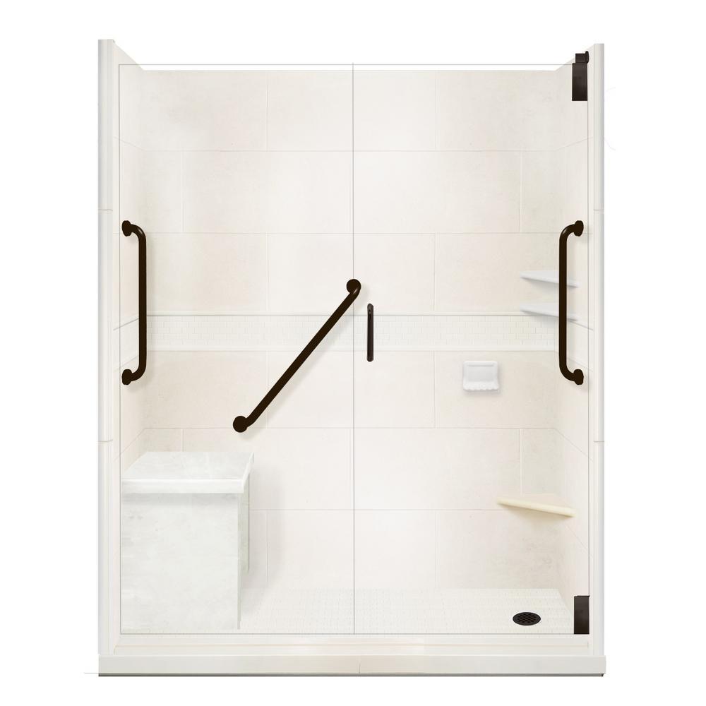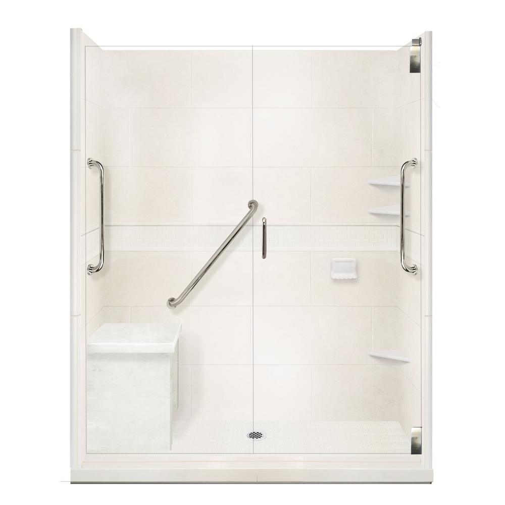 Grand hinged freedom alcove shower kit includes: shower base with a right drain, natural buff walls with classic 1 in. x 2 in. mini subway tile accents, shaving step/shelf, soap dish, rectangle bench, 3 metal grab bars, two 8 in. corner shelves, drain and the glass enclosure surround with chrome hardware