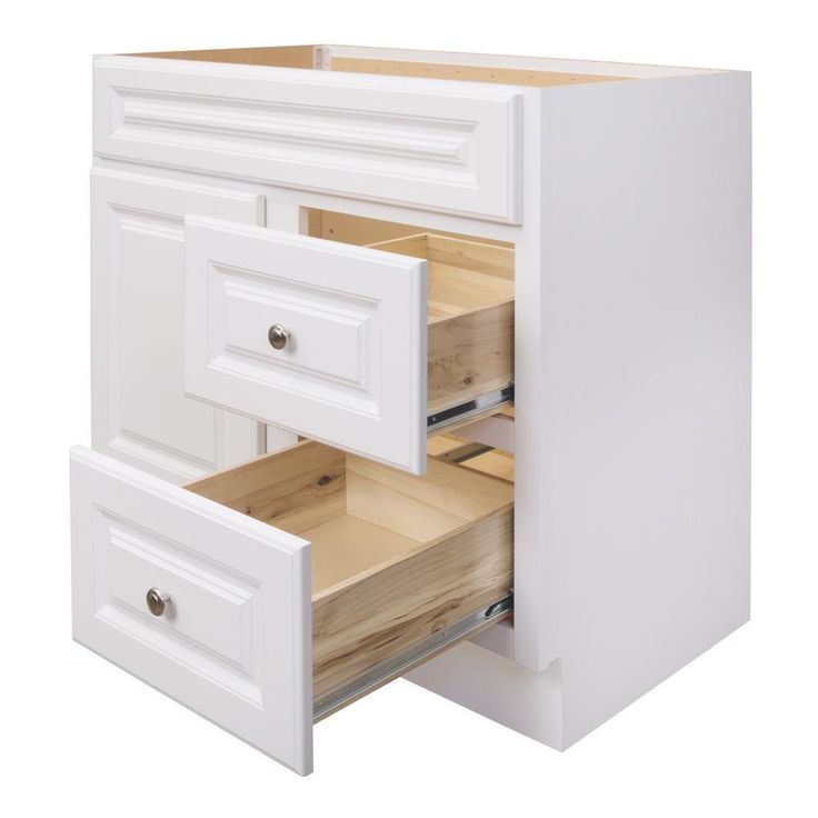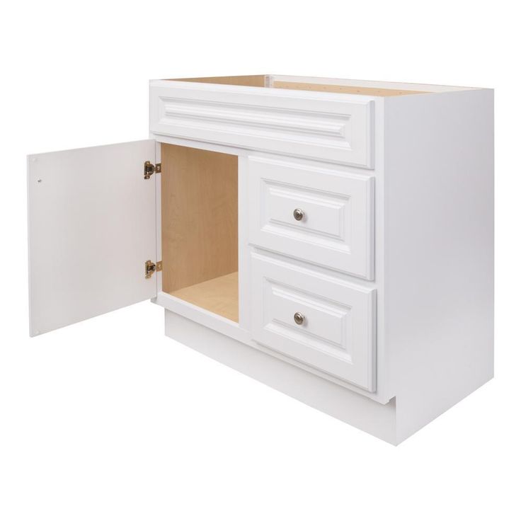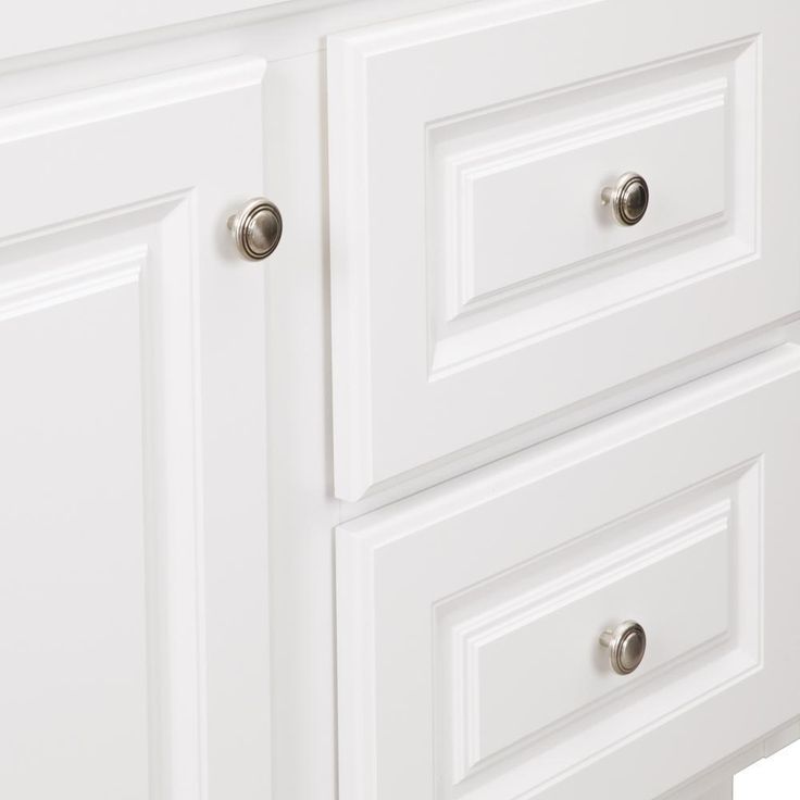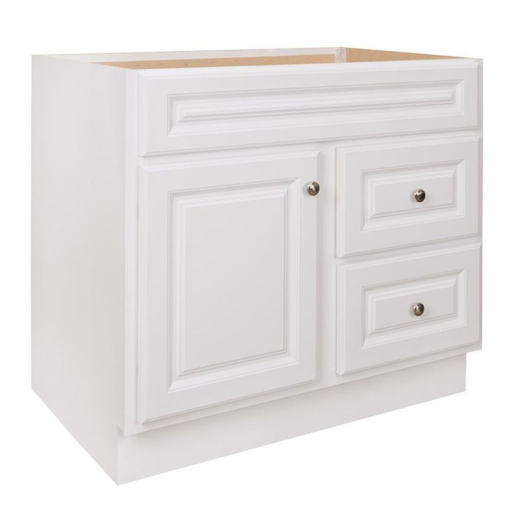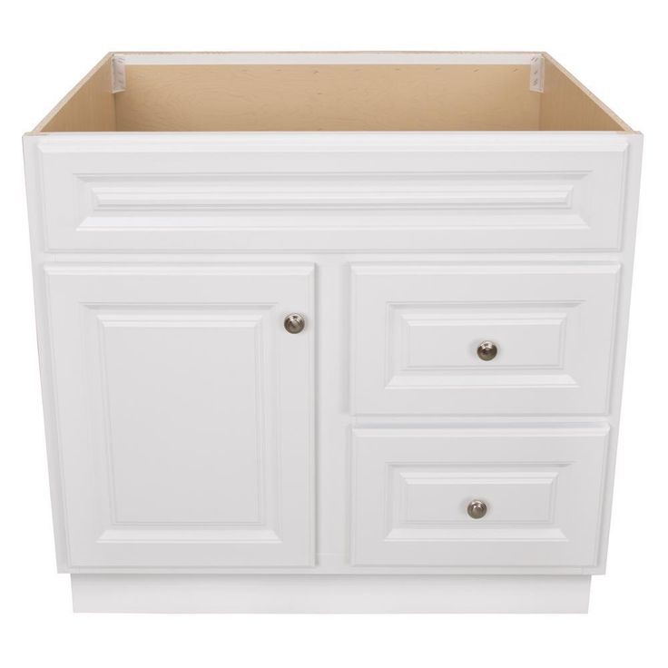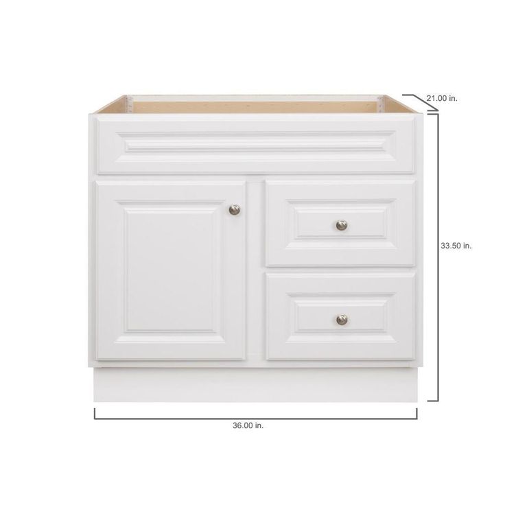The Glacier Bay Hampton 36 in. W x 21 in. D x 33.5 in. H Vanity Cabinet Only in White is durably constructed with medium-density fiberboard (MDF) in a fresh white finish for a classic look that will complement many decor styles. Beautifully accented with nickel hardware, this stylish and functional vanity has plenty of storage space for toiletries and household items with 2-large drawers and a single cabinet all with an attractive maple interior that is easy to clean. Pre-assembled for easy installation, this vanity accommodates a vanity top with a single center set sink basin and will provide years of use and enjoyment. Limited Lifetime Warranty.
