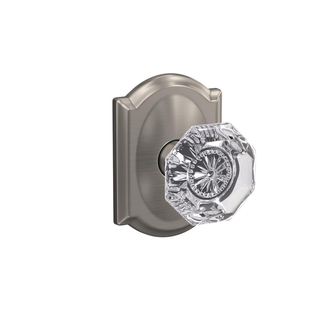 The Schlage Custom Alexandria Glass Knob with Camelot Trim Passage and Privacy Lock in Satin Nickel is uniquely designed to work on both Hall/Closet and Bed/Bath doors. It’s easy to switch between locking and non-locking functions. Just insert or remove the locking pin from the pinhole on the interior side of the hardware. Schlage Custom hardware is also designed with premium style in mind, featuring low profile trim and concealed screws for a more polished look. Inspired by the Victorian era, the Alexandria glass knob is multi-faceted with classic detailing sparkling in the center, while the Camelot trim’s scalloped architectural details make any room charming and approachable - especially when wrapped in our versatile Satin Nickel finish.