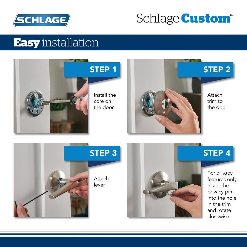 The Schlage Custom Latitude Lever with Century Trim Passage and Privacy Lock in Matte Black is uniquely designed to work on both Hall/Closet and Bed/Bath doors. It’s easy to switch between locking and non-locking functions. Just insert or remove the locking pin from the pinhole on the interior side of the hardware. Schlage Custom hardware is also designed with premium style in mind, featuring low profile trim and concealed screws for a more polished look. The Latitude lever offers a crisp perspective on minimalist design with its clean lines and rectangular features, while the Century trim is chic with a delicate, slightly curved shape. The striking appearance of the Matte Black finish creates an elegant look that’s sure to be noticed in any style setting.