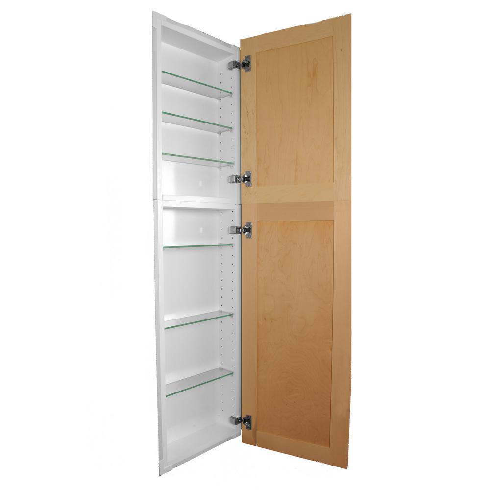 Unique Frameless Medicine/Pantry cabinet available in six heights and multiple finishes, Perfect for any bathroom or kitchen. Recesses in the wall between the studs and simply screws to the studs on each side of the opening. Only the door is outside the wall, so there is no chunky frame to ruin the clean and modern look. 5-fully adjustable shelves are included on the 44 model. Patented design keeps each shelf in place. Shelves slide in the supports, so the shelves can’t fall off or move. Blum concealed hinges with soft close built in assures the door will never slam shut. Solid Pine box with a Shaker style door in solid maple. We have painted the inside of the box white, so you don’t have to. 3-versions to choose from 1) get your door unfinished, primed or white. Thin plastic trim surround on the box covers the rough edges of your drywall opening, but you will only see that trim surround when you open the door the door covers it when closed. The box is 3.5 in. deep inside and gives you plenty of usable depth, but fits in standard 2 in. x 4 in. walls. The door only projects about 1 from the wall when closed. The door is NOT drilled for a knob, so it is reversible to open either Left or Right nickel knobs are included but not installed. Completely assembled, all you need to do is put one screw in each hinge to mount the door. Then insert it into the wall and screw it to the studs with included screws.