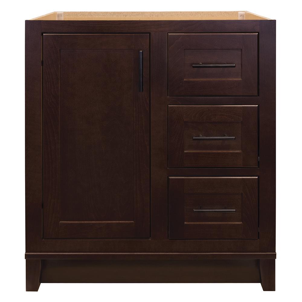 The Shaker-inspired styling of the white Glacier Bay Kinghurst Vanity is a simple solution to upgrade your bath or powder room decor. Beautifully accented with brushed nickel cabinet hardware, this attractive vanity has 3-large storage drawers with full access glides and a single cabinet for ample storage space. The cabinet measures 30 in. W x 21 in. D x 33.5 in. H and comes fully assembled. This transitional-style vanity cabinet is durably constructed and has a maple-finished interior and comes pre-assembled, ready to support a vanity top of your choosing.