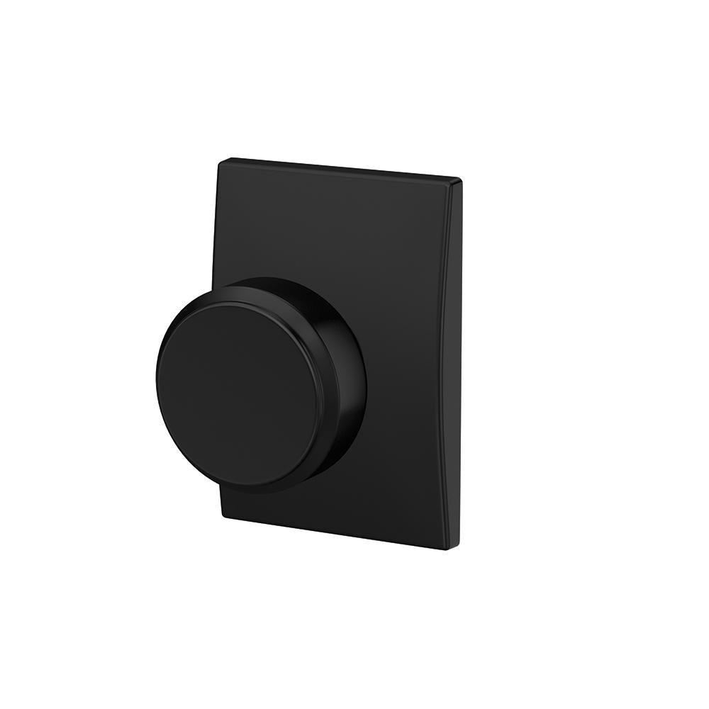 The Schlage Custom Bowery Matte Black Dummy Door Knob with Century Trim is uniquely designed with premium style in mind, featuring low profile trim and concealed screws for a more polished look. Schlage Custom dummy hardware comes in pairs, making it perfect for French doors. The Bowery knob's clean lines and minimalist design give it a futuristic look that is as modern as it is stylish, while the Century trim is chic with a delicate, slightly curved shape. The striking appearance of the Matte Black finish creates an elegant look that's sure to be noticed in any style setting.