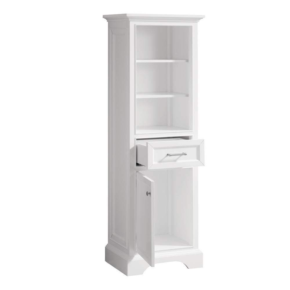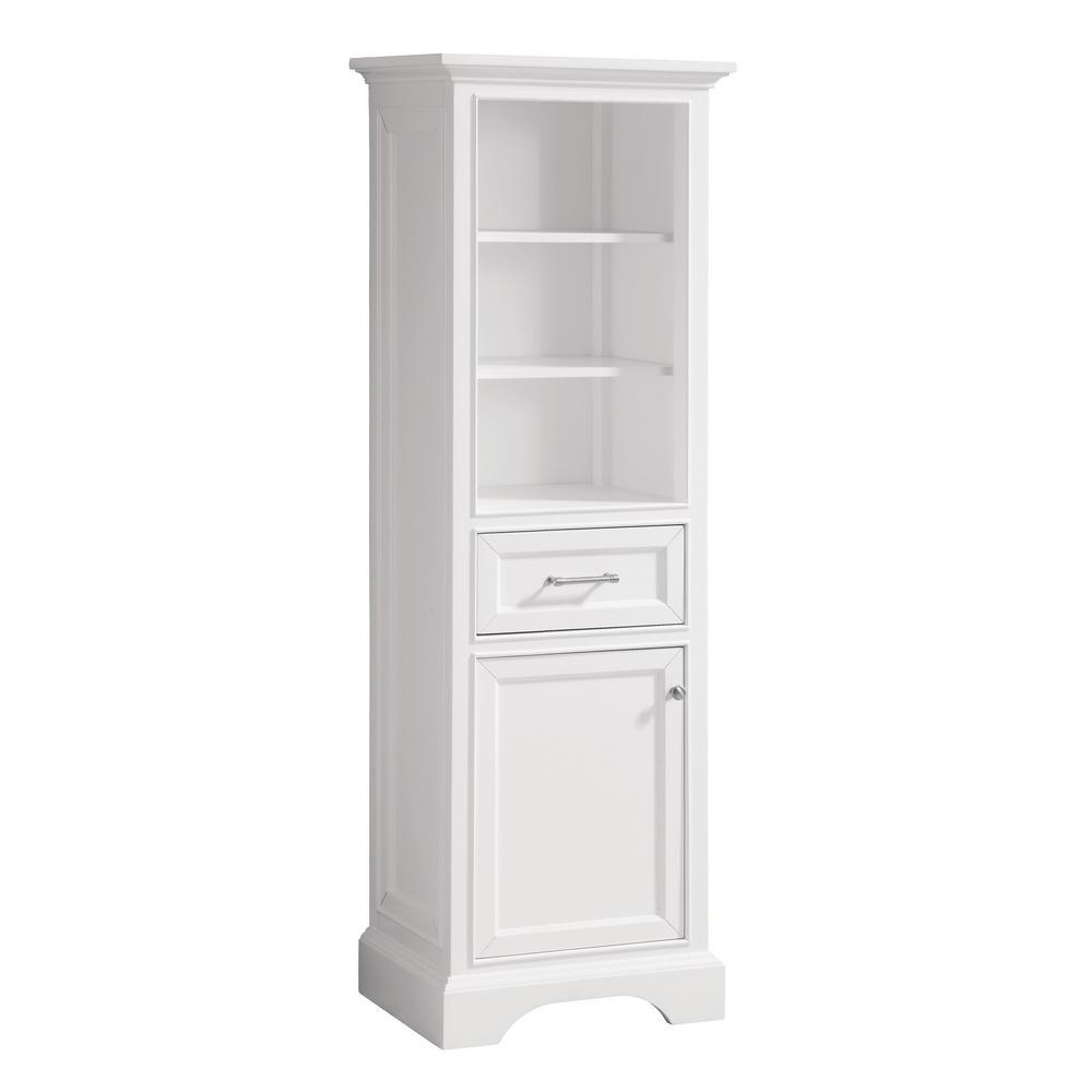 The Windlowe Collection features classical design enhanced by a soothing White finish, creating an aesthetic that mixes flair and function. The Windlowe 22 in. W linen tower showcases its quality and style with a solid wood frame, chic chrome hardware and soft-close hinges and glides. 2 interior shelves provide ample storage.