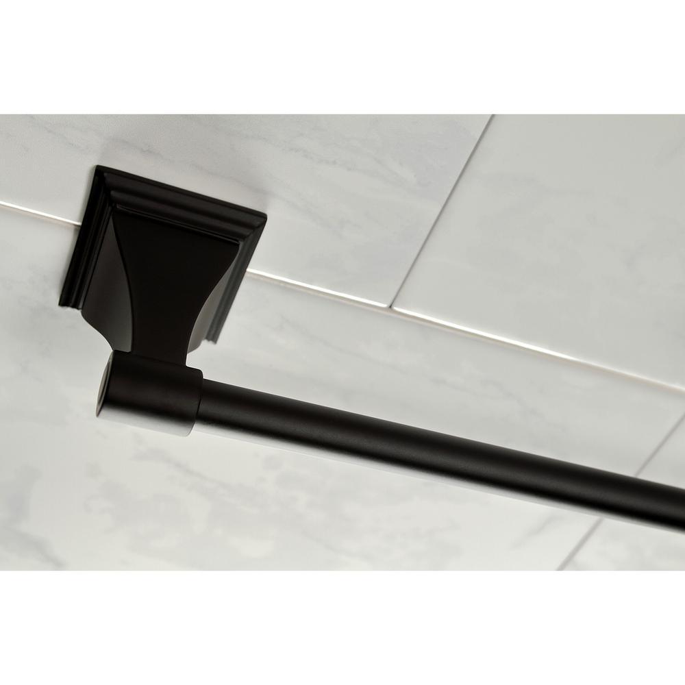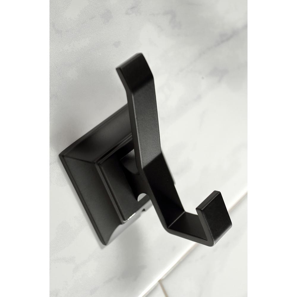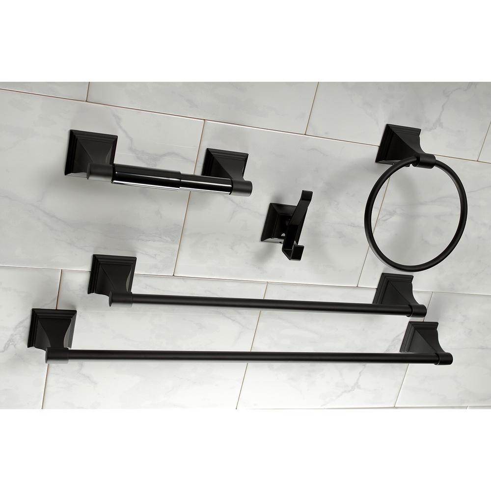 Crafted to exude an air of discreet sophistication, this set features a sturdy zinc construction with a sleek black finish. Perfect for contemporary spaces, its bold, geometric lines add a touch of modernity. Includes a 24 in. and 18 in. towel bar, a towel ring, robe hook, and tissue holder, all of which are effortlessly installed with the provided hardware. Plus, the concealed mounting design ensures a seamless appearance with no visible hardware, maintaining a polished look in your bathroom. The reliable durability of high-quality zinc ensures long-lasting use, while the 24 in. towel bar offers ample drying space and the 18 in. bar is perfect for compact walls. With a wall-mount robe hook to prevent door damage from over-door hooks, this set is the epitome of functional design. Finished in a classic black hue, it adds a touch of elegance to any space.