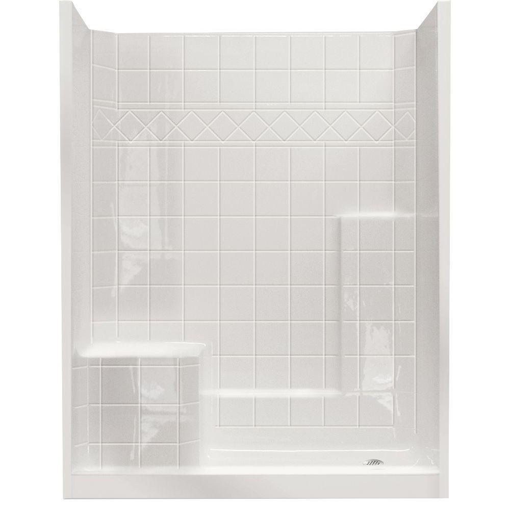 Features Built-in shower seat, shelves, slip-resistant floor, molded soap/foot ledge, pre-leveled base