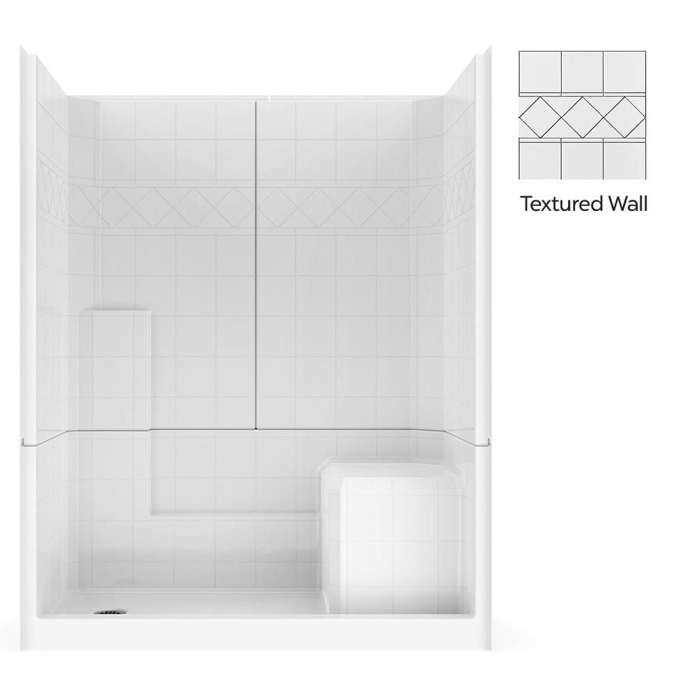 Durable 3-piece alcove shower kit featuring AcrylX applied acrylic over ArmorCore reinforcement for a glossy, easy-to-clean, truer white finish. Includes a molded left-hand seat, right-hand drain, slip-resistant base, and integrated shelves for safe, convenient everyday use.